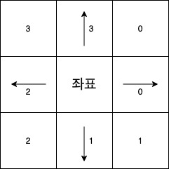 반대로 현재 방향이 0이고, 반시계 방향으로 90도 회전한다고 하면 ndir은 3이 되고 체크해줘야 할 벽의 위치 인덱스는 0이 된다.