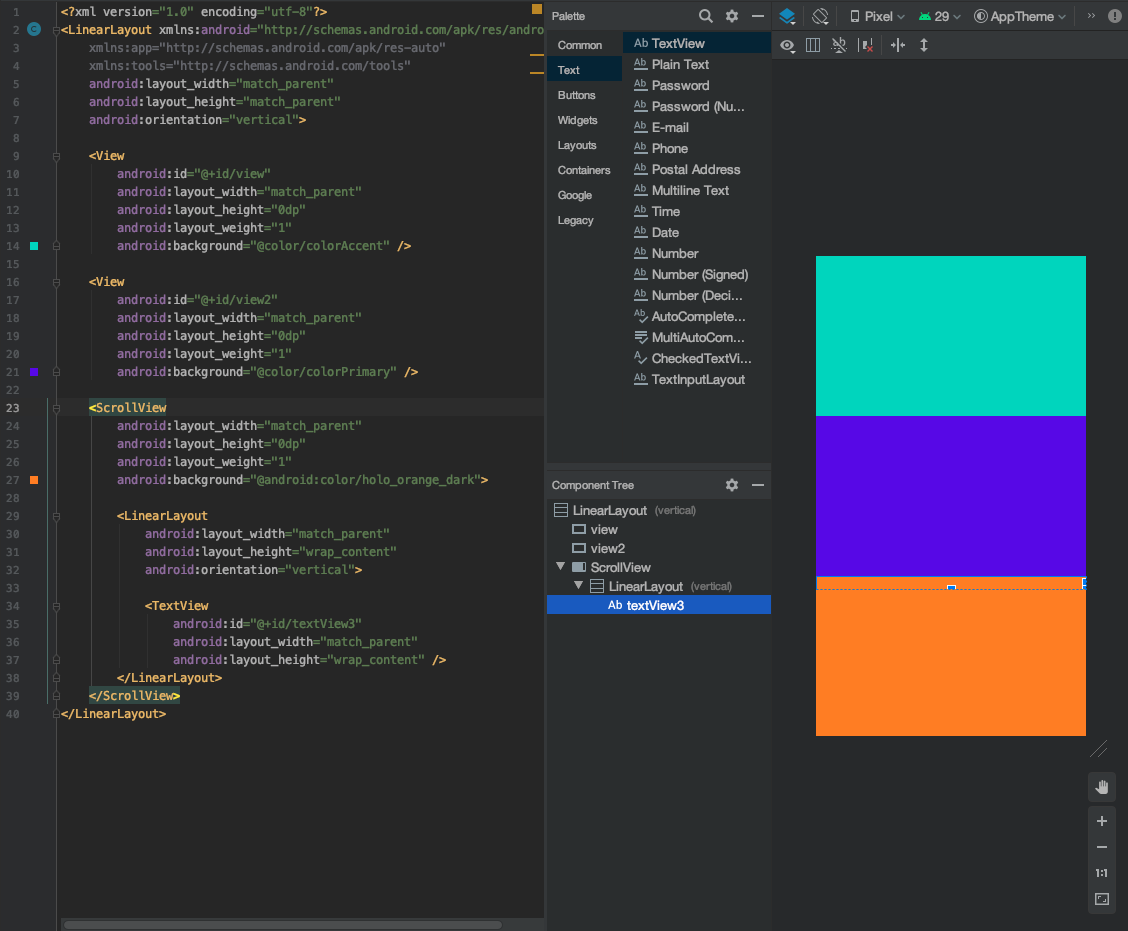 터치 이벤트가 어떻게 동작하는지 살펴보기 위해 아래의 그림과 같이 XML을 작성한 뒤, 소스 코드를 추가한다.
