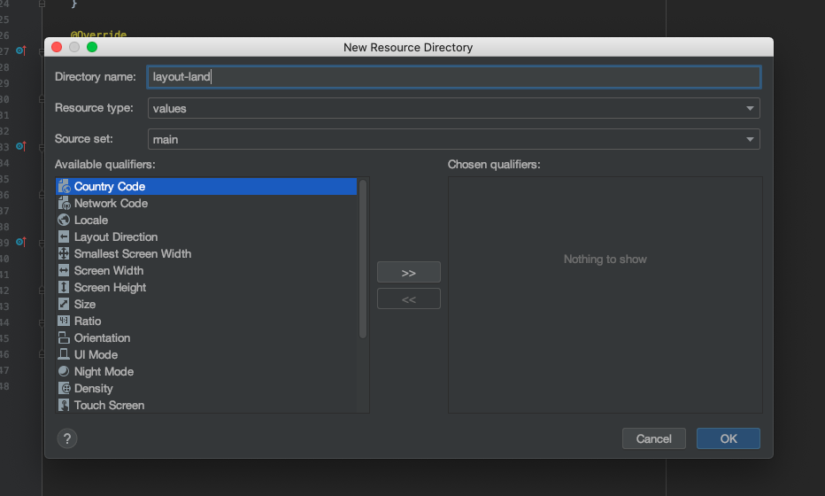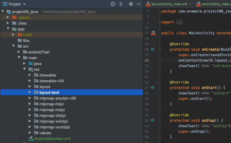 가로 방향의 XML 레이아웃은 보통 app/res/layout-land에 저장을 한다. layout-land 폴더를 생성하기 위해 res 폴더에서 New -> Android Resource Directory를 선택해준다. 그 후 폴더 이름을 layout-land로 지정한 뒤 OK 버튼을 눌러주자. (layout-land 폴더 이름은 미리 지정된 것이기 때문에 다른 이름을 사용하면 안된다.)