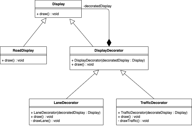 - RoadDisplay 객체에 대한 참조는 DisplayDecorator 클래스에서 Display 클래스로의 composition 관계를 통해 표현되고 있다.