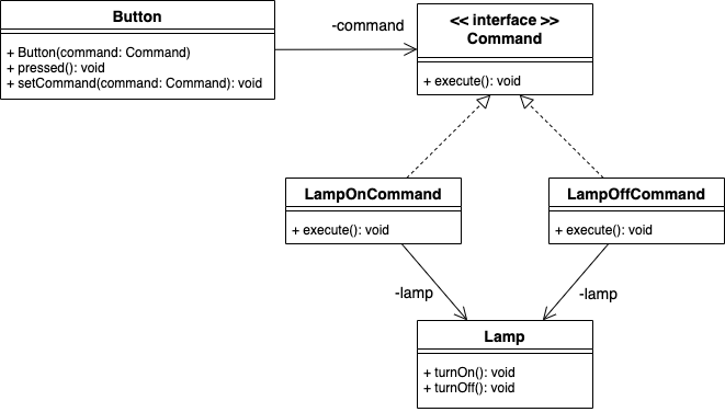 Client 클래스에서는 Command 인터페이스를 구현하는 LampOnCommand와 LampOffCommand 객체를 Button 객체에 설정한다. 그리고 Button 클래스의 pressed 메서드에서 Command 인터페이스의 execute 메서드를 호출할 수 있게 함으로써 LampOnCommand와 LampOffCommand 클래스의 execute 메서드를 실행할 수가 있다.