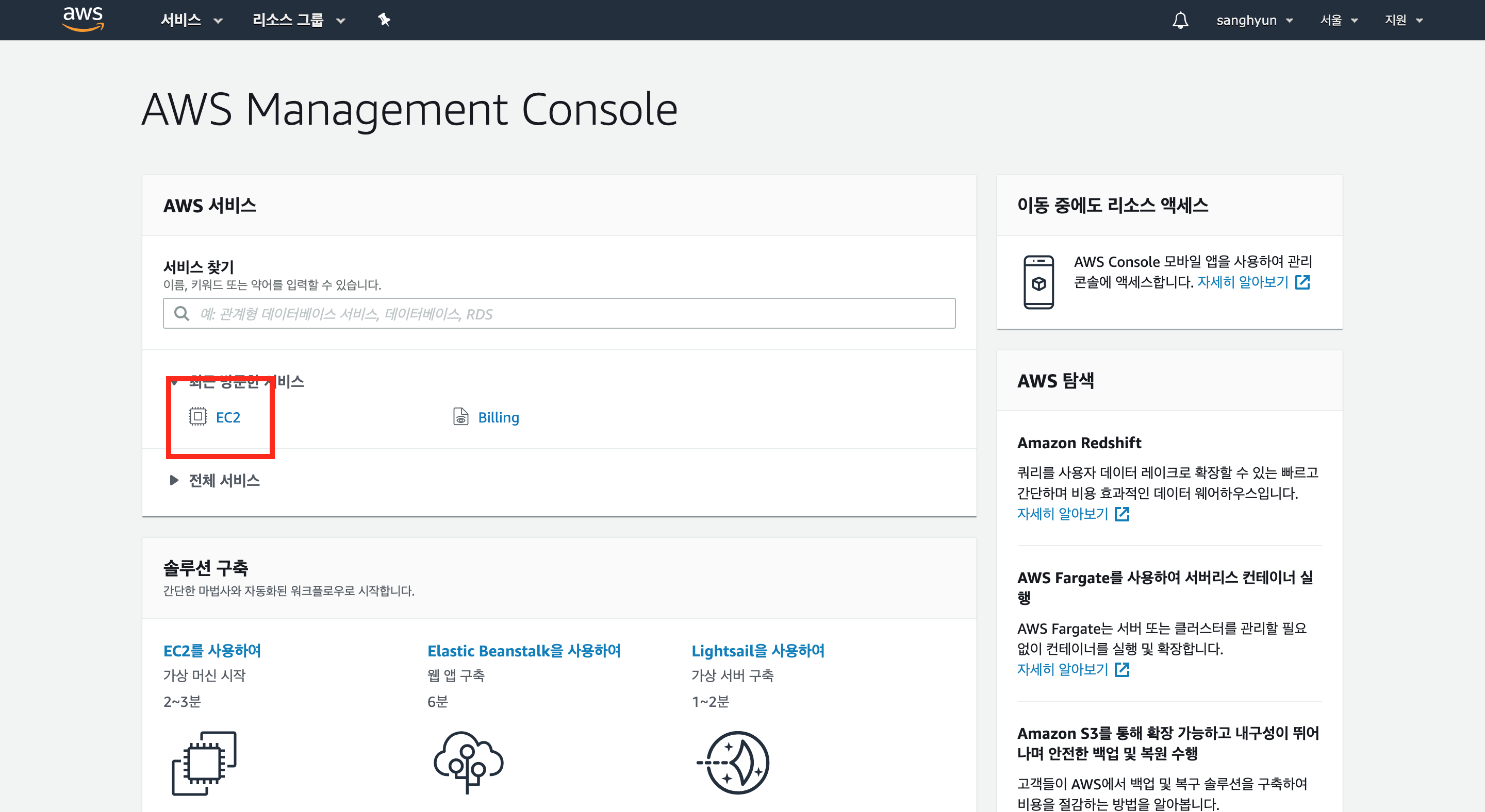 로그인을 하면 콘솔 화면으로 들어가진다. EC2 인스턴스를 생성하기 위해 검색창에 EC2라고 검색을 한 뒤 클릭한다.