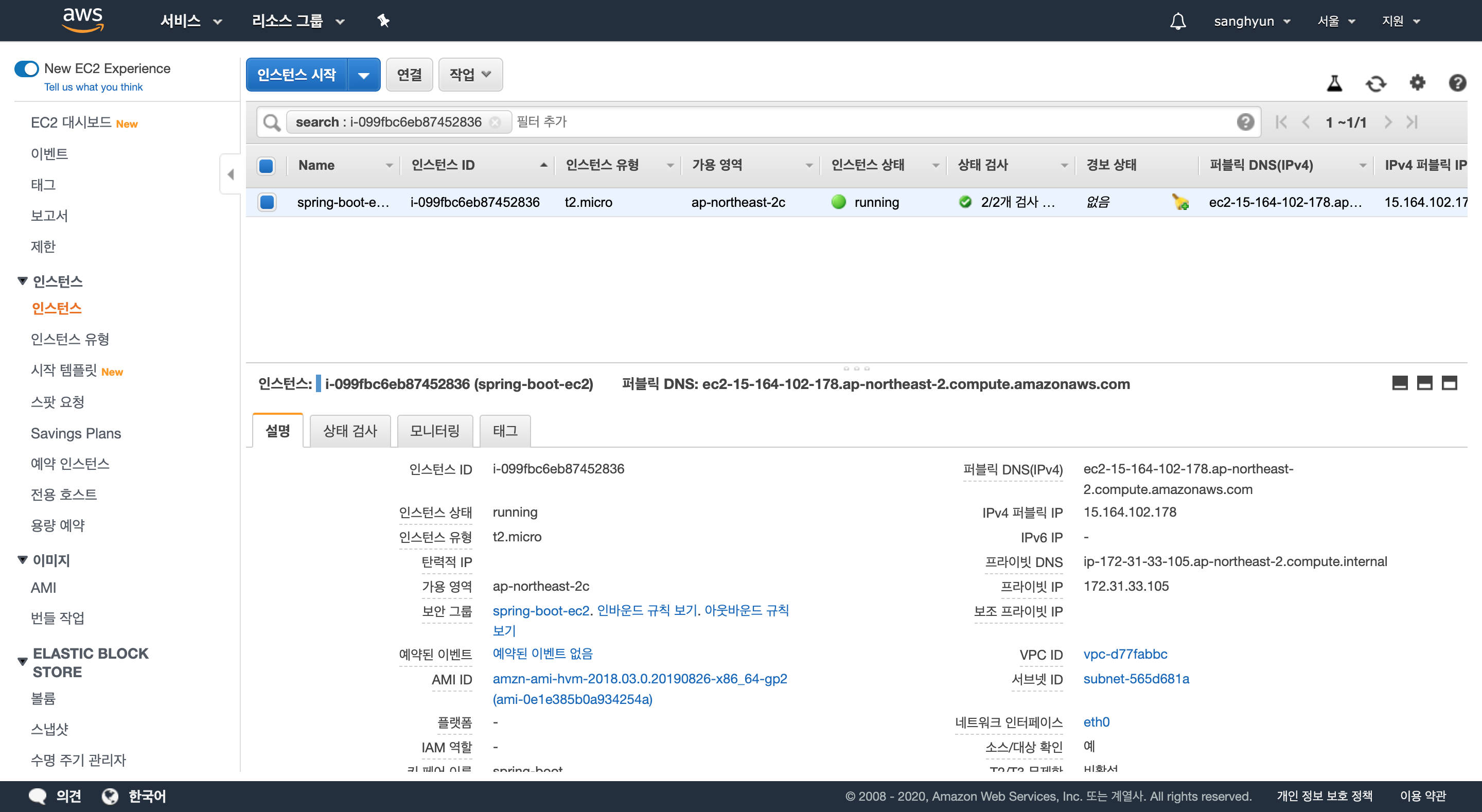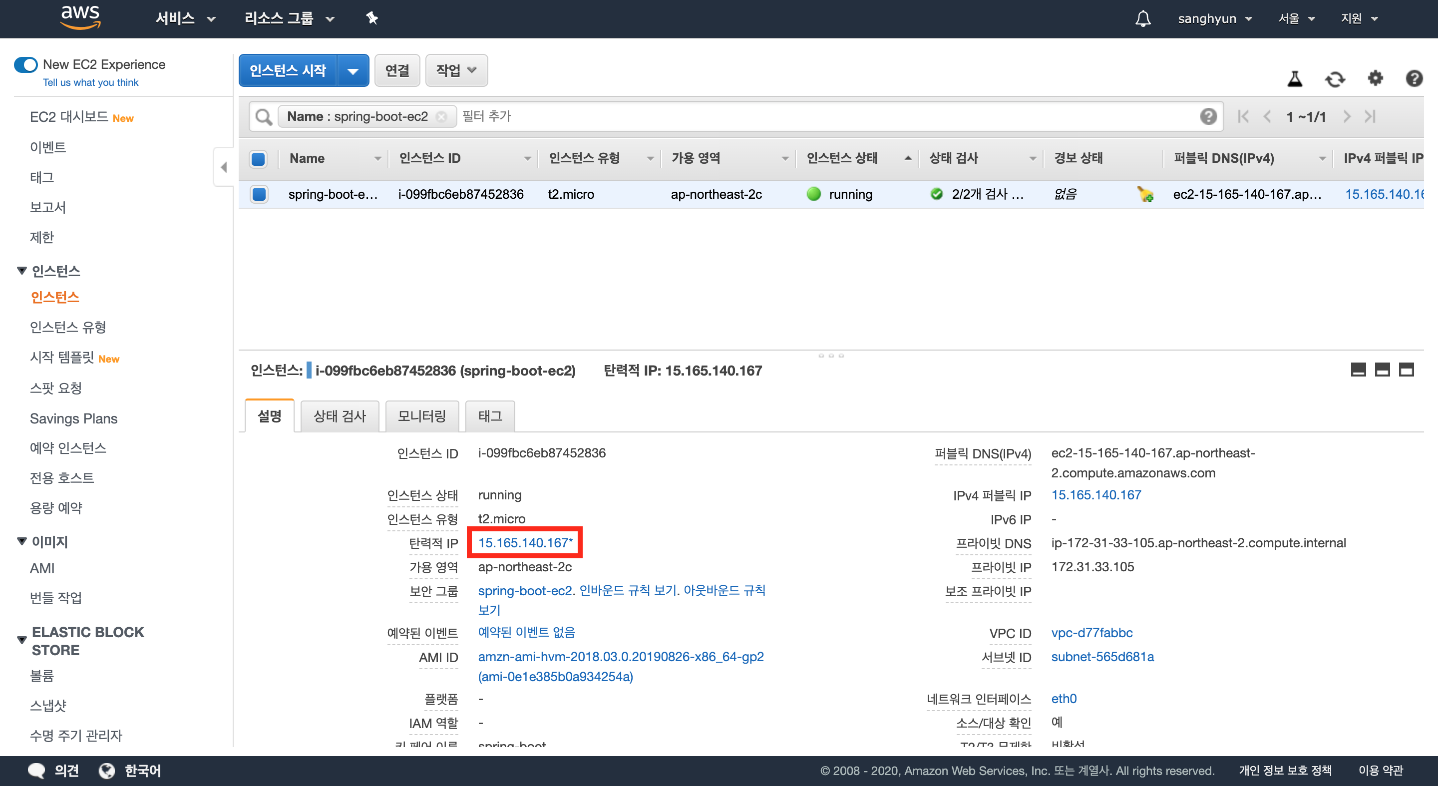 인스턴스 목록으로 다시 돌아와서 탄력적 IP가 잘 연결되었는지 확인한다.
