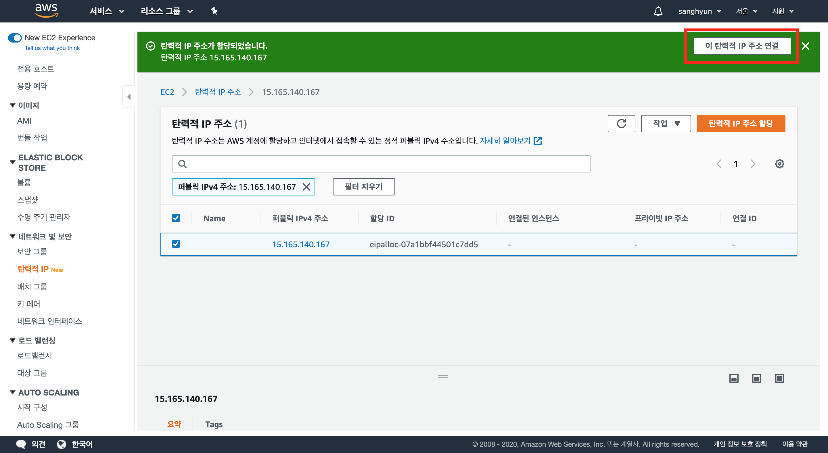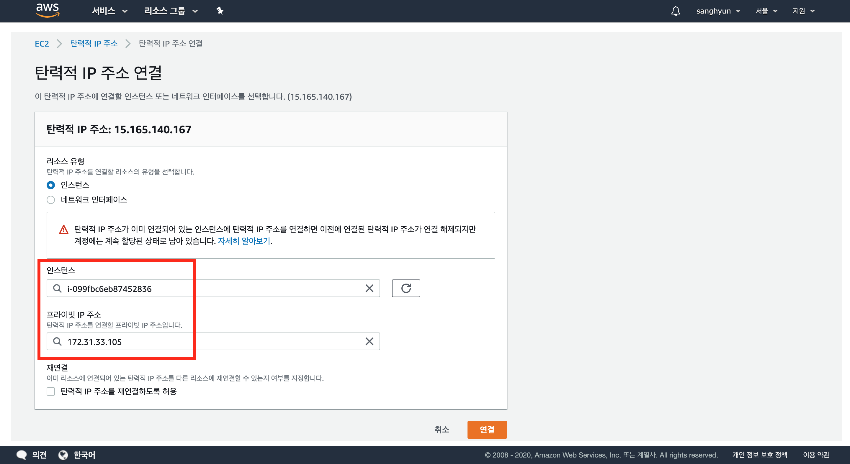 방금 생성한 탄력적 IP와 EC2 주소를 연결한다.