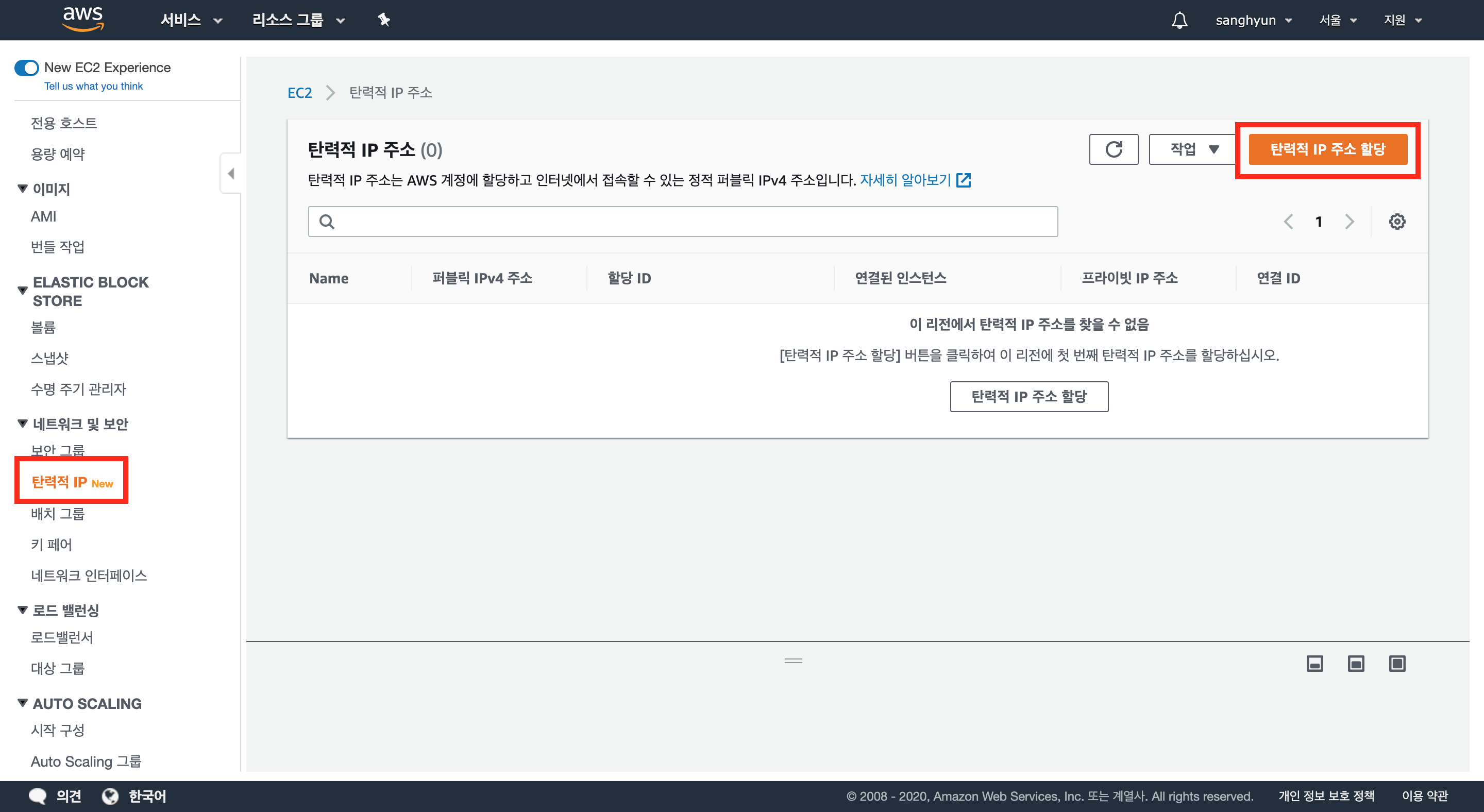 왼쪽 카테고리에서 탄력적 IP를 선택하고 [탄력적 IP 주소 할당] 버튼을 클릭하자.