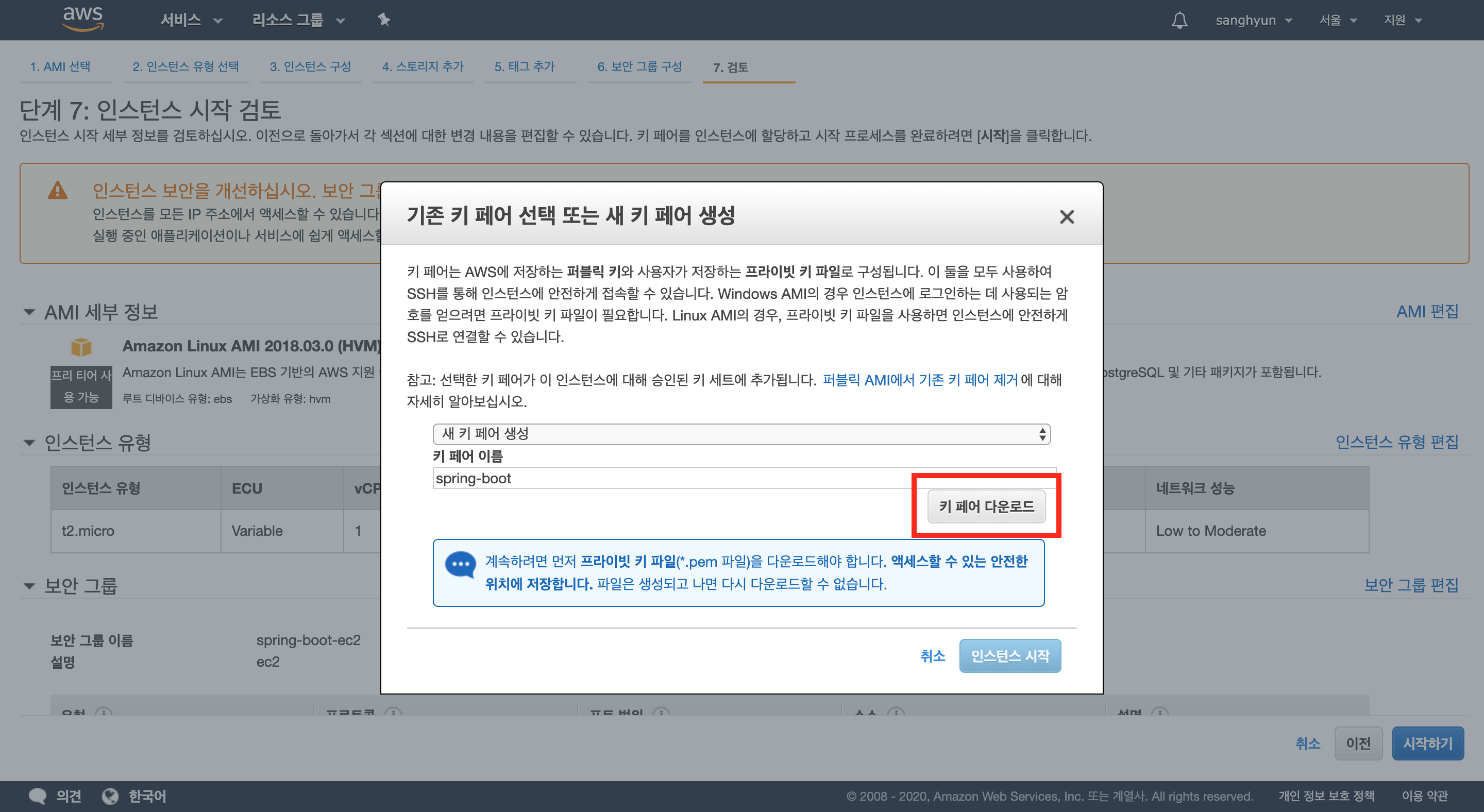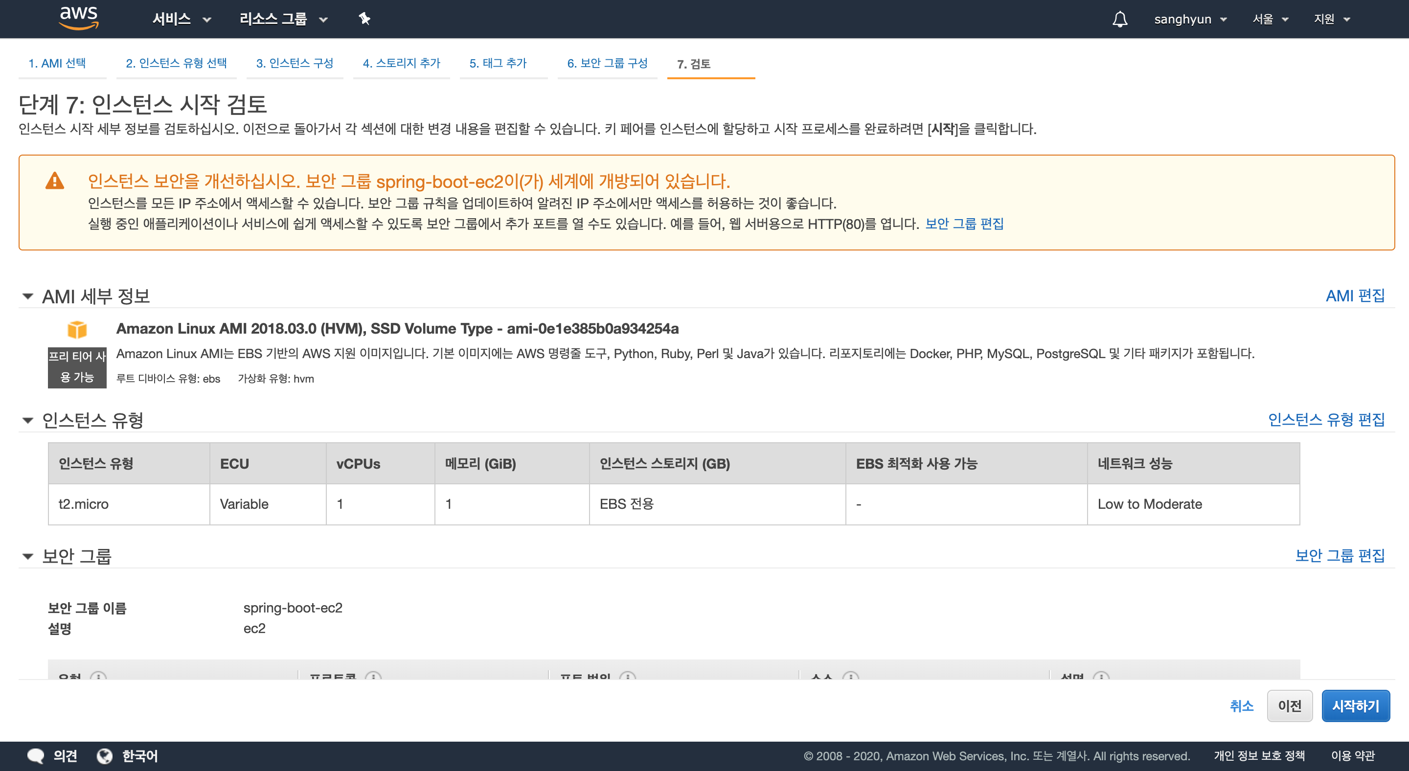 검토 화면에서 보안 그룹 경고가 뜬 것을 확인할 수 있다. 이는 8080이 전체 오픈되어서 발생하는 경우로, 8080을 열어 놓는 것은 위험한 일이 아니니 넘어가도록 하자.