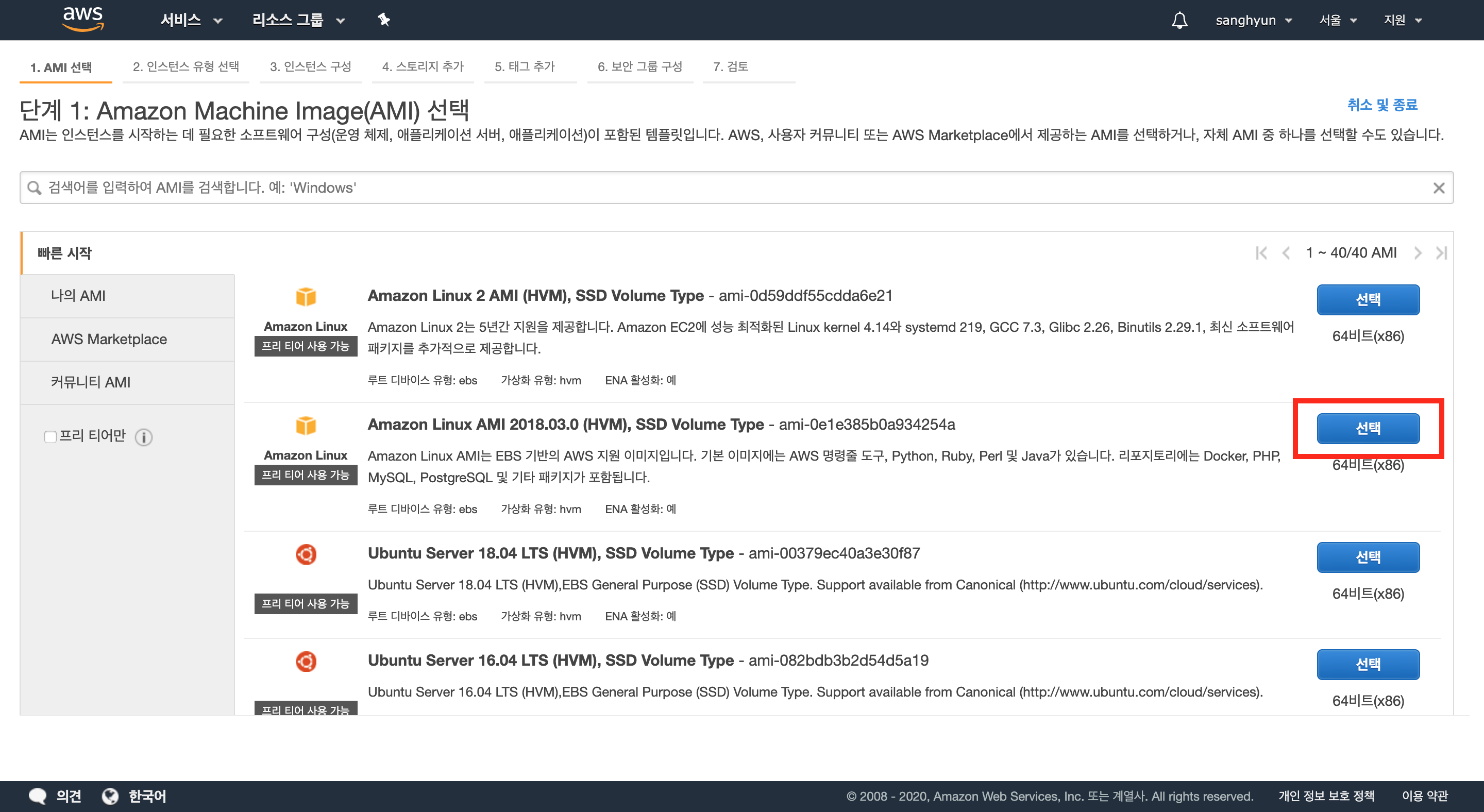 인스턴스를 생성하는 첫 단계는 AMI(Amazon Machine Image)를 선택하는 것이다. AMI는 EC2 인스턴스를 시작하는 데 필요한 정보를 이미지로 만들어 둔 것을 이야기한다. 여기서는 아마존 리눅스 1 AMI를 선택할 것이다.