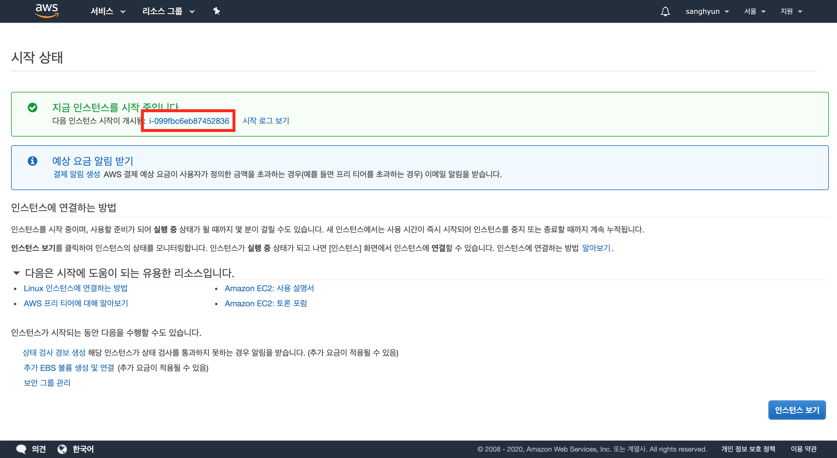 pem 키를 다운로드한 후 [인스턴스 시작]을 누르면 인스턴스 생성 시작 페이지로 이동하고 인스턴스 id를 클릭하면 EC2 목록으로 넘어가진다.