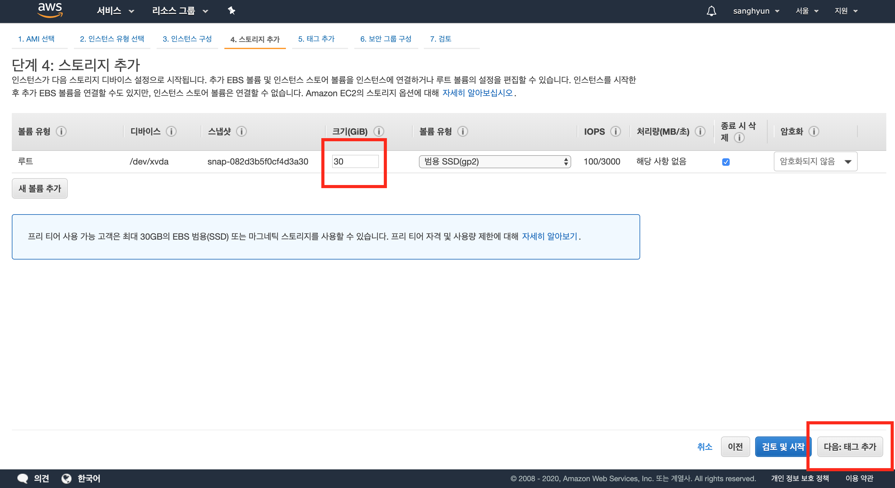 다음은 스토리지 추가 단계이다. 서버의 용량을 얼마나 정할지 선택하는 단계이다. 기본값은 8GB인데, 프리티어로 30GB까지 가능하다. 따라서 30GB로 변경한 후 다음으로 넘어가자.