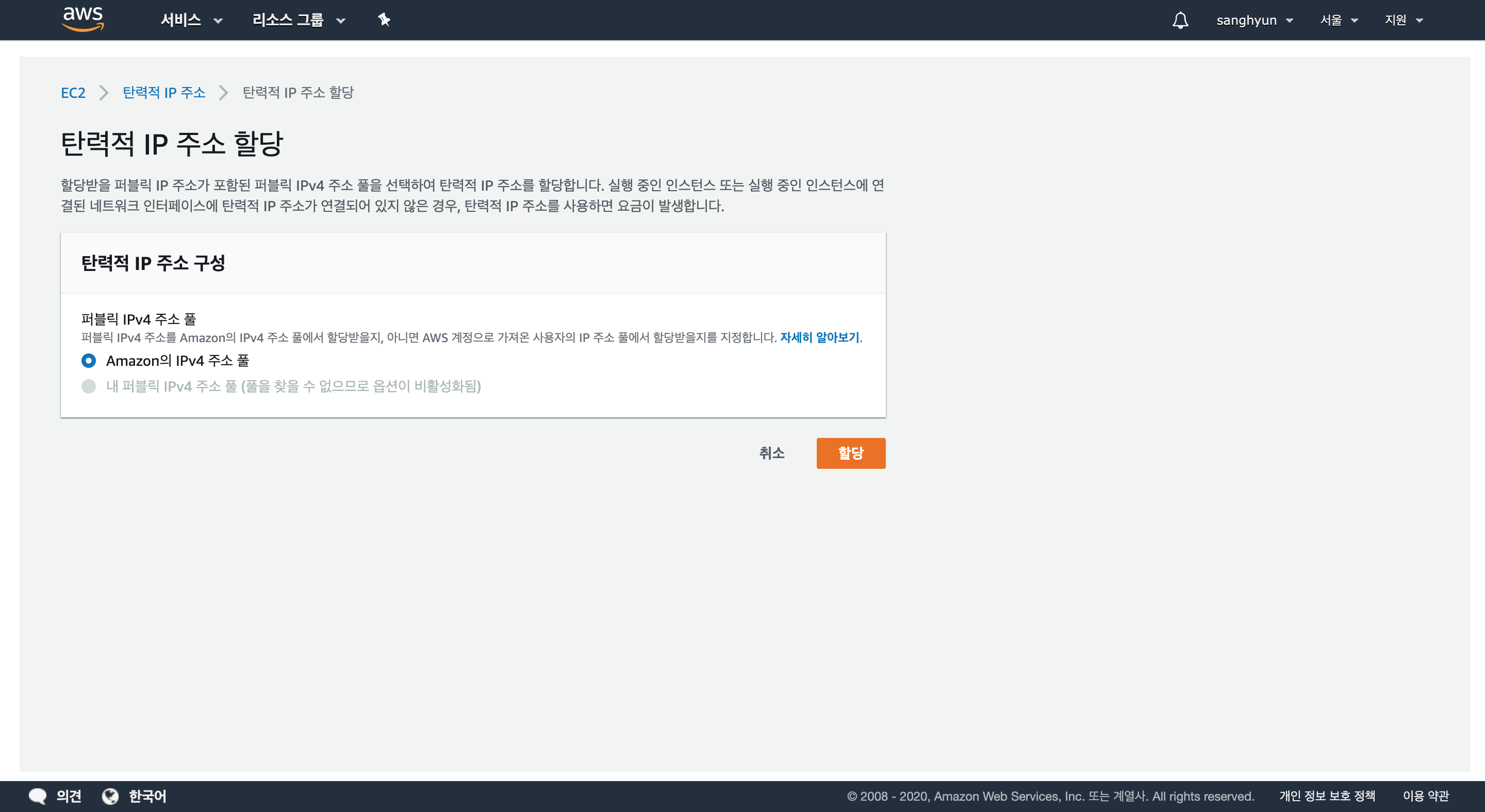 다음 화면에서 [할당] 버튼을 누르면 탄력적 IP가 발급된다.