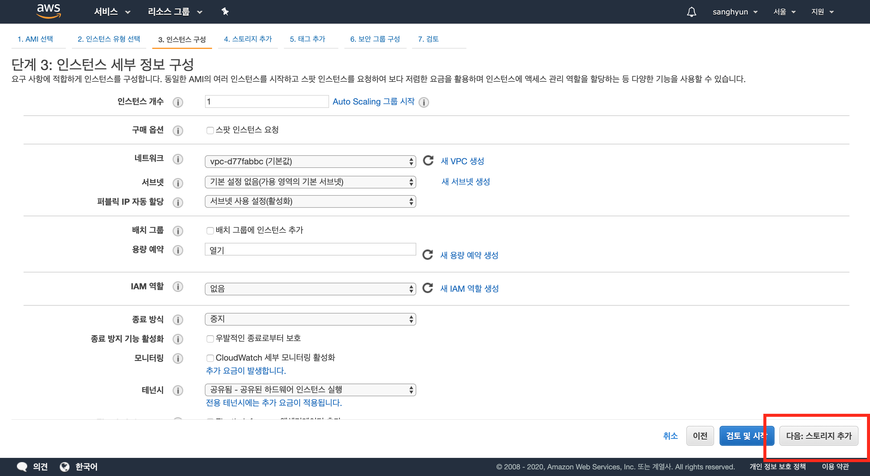 다음은 세부 정보 구성 단계이다. 기업에서 사용할 경우 화면상에 표기된 VPC, 서브넷 등을 세세하게 다루지만, 지금은 1대의 서버만 사용하니 별다른 설정을 하지 않고 넘어간다.