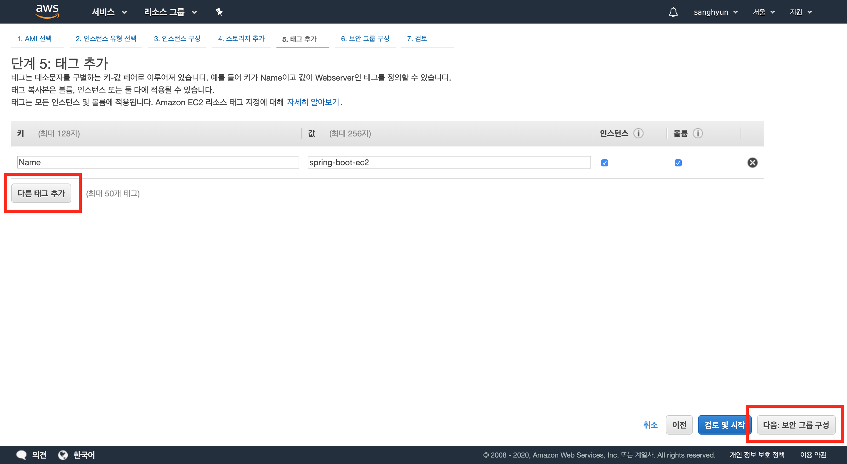 다음은 태그 추가 단계이다. 태그에는 웹 콘솔에서 표기될 태그인 Name 태그를 등록한다. 태그는 해당 인스턴스를 표현하는 여러 이름으로 사용될 수 있다. EC2의 이름을 붙인다고 생각하면 된다. 여러 인스턴스가 있을 경우 이를 태그별로 구분하면 검색이나 그룹 짓기 편하므로 본인 서비스의 인스턴스를 나타낼 수 있는 값으로 등록한다.
