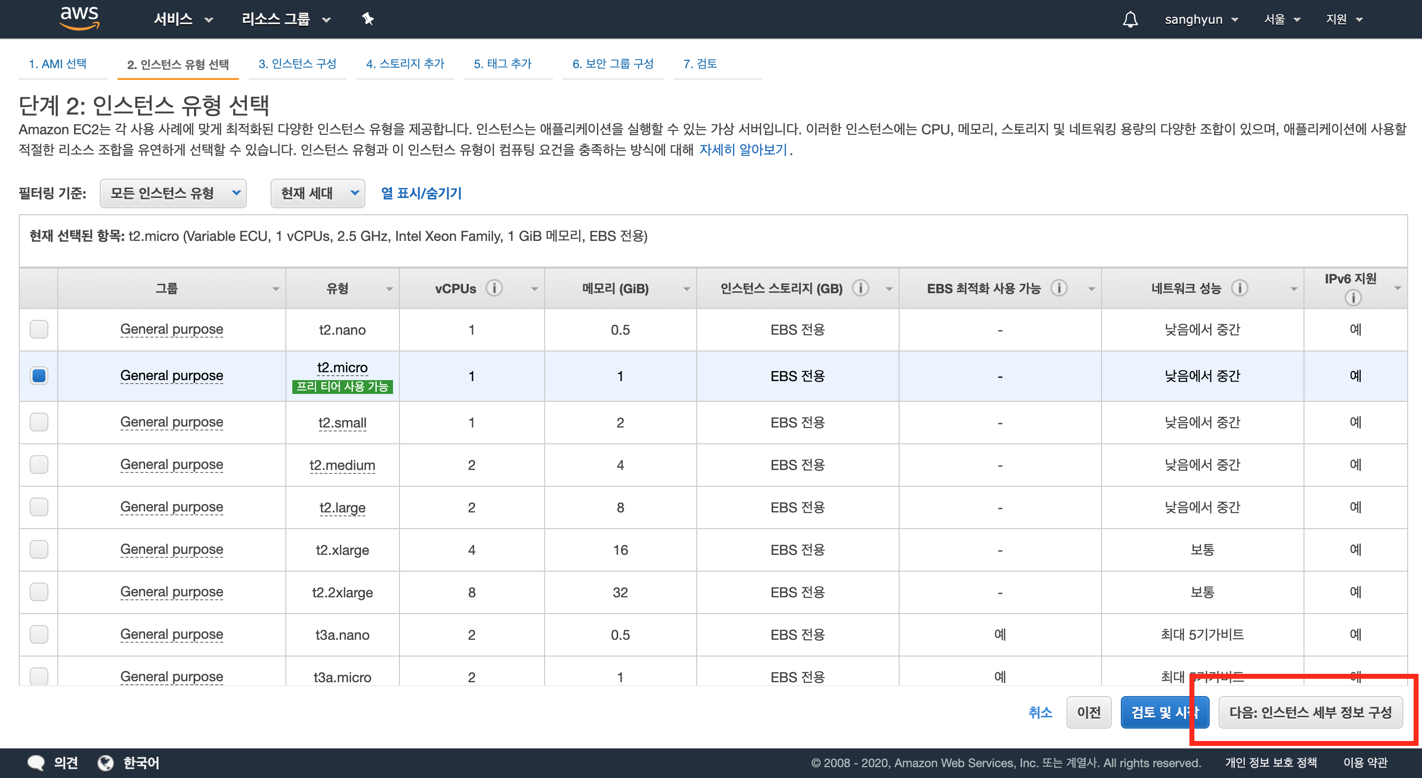 인스턴스 유형을 선택하는 단계이다. 현재는 프리티어를 사용 중이기에 t2.micro를 선택한다.
