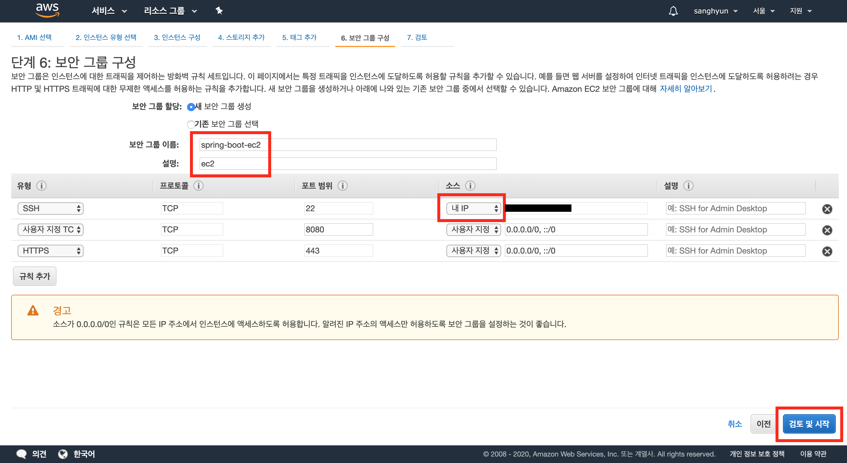 검토 화면에서 보안 그룹 경고가 뜬 것을 확인할 수 있다. 이는 8080이 전체 오픈되어서 발생하는 경우로, 8080을 열어 놓는 것은 위험한 일이 아니니 넘어가도록 하자.