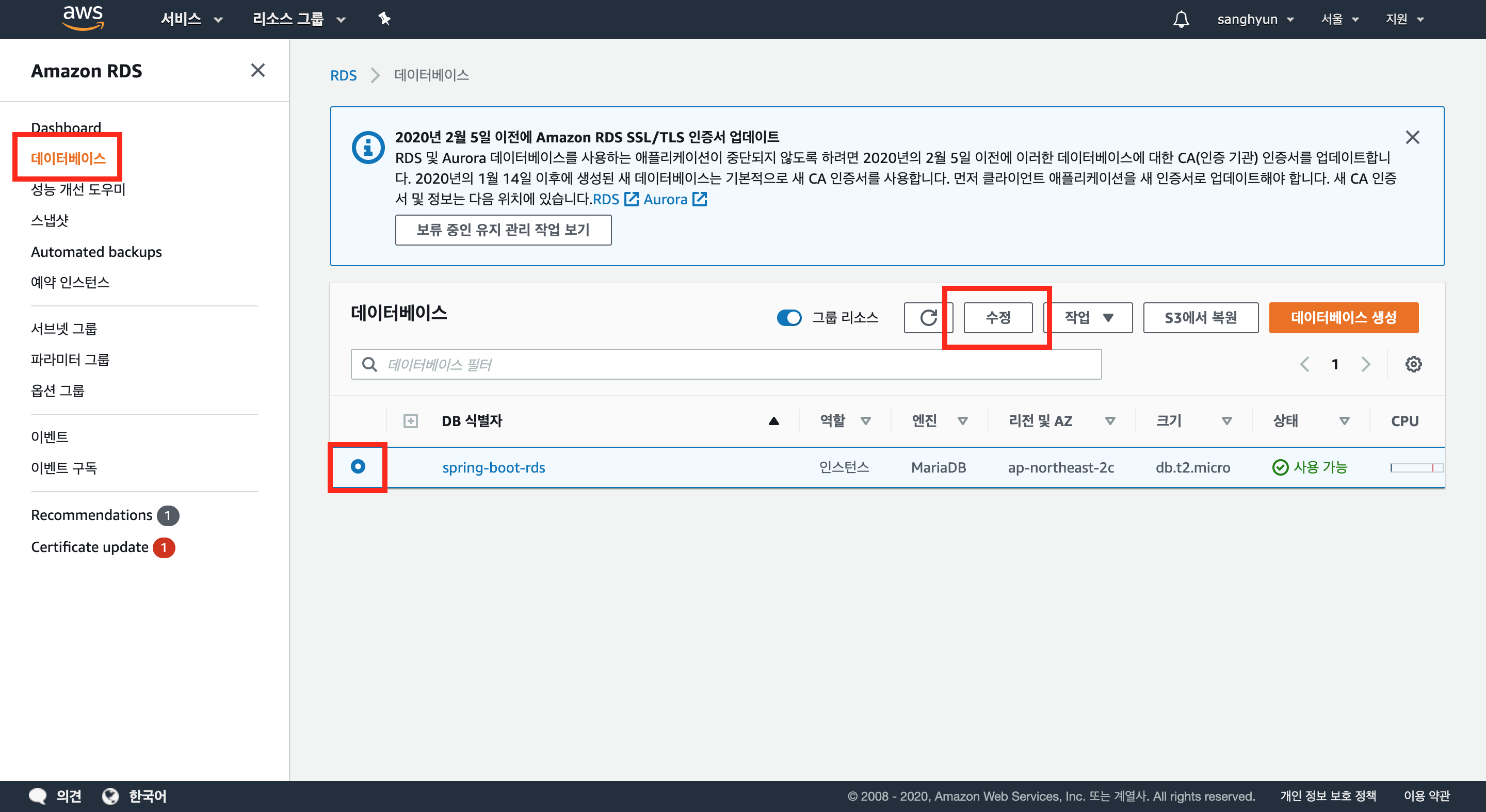 이제 생성된 파라미터 그룹을 데이터베이스에 연결해준다. 왼쪽 카테고리에서 데이터베이스를 클릭한 후, 아까 생성했던 인스턴스의 [수정] 버튼을 눌러준다.