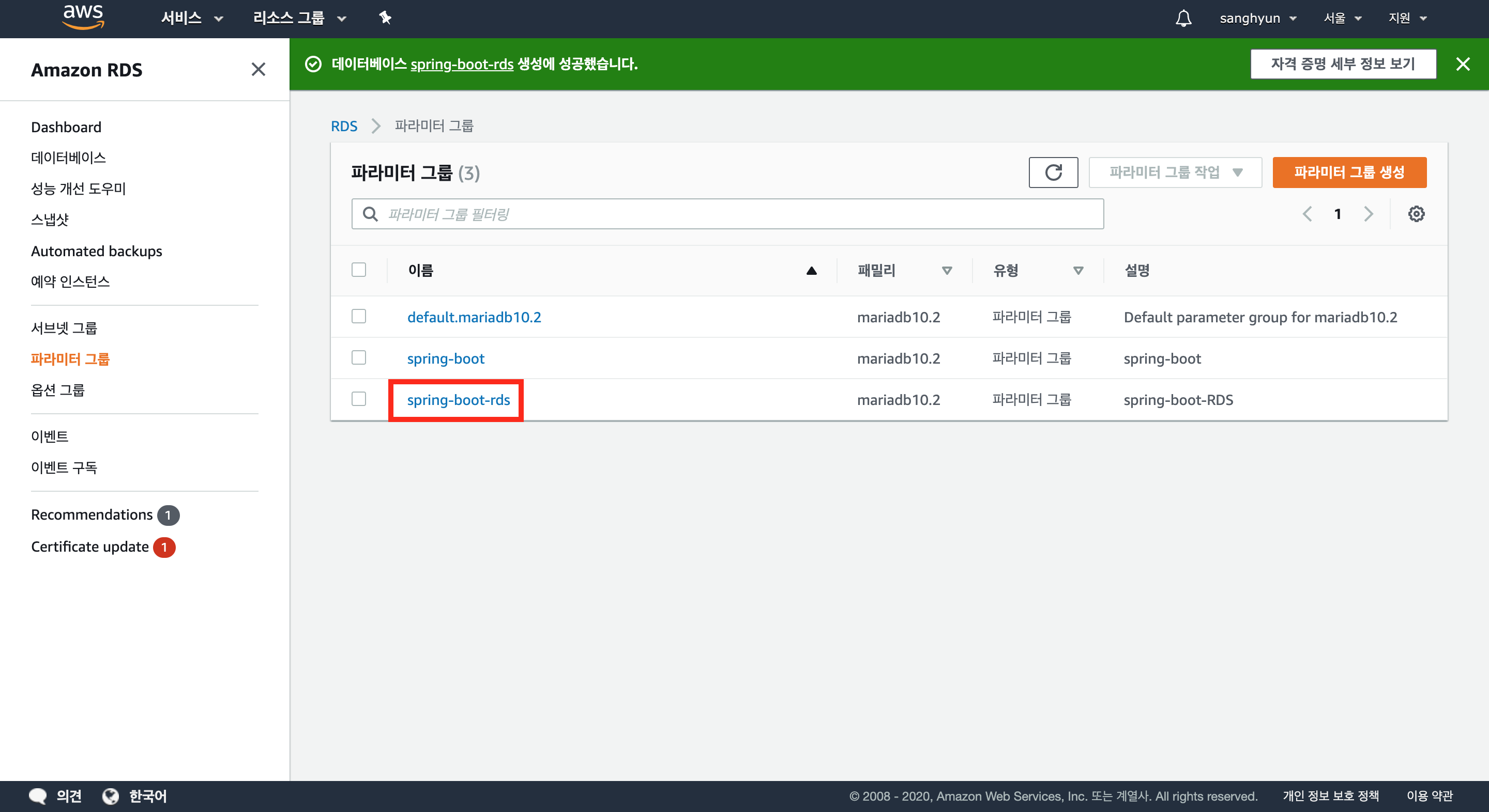 생성한 파라미터 그룹을 클릭해준다. 위에 초록색 알림창으로 인스턴스 생성에 성공했다는 알림이 뜬다.