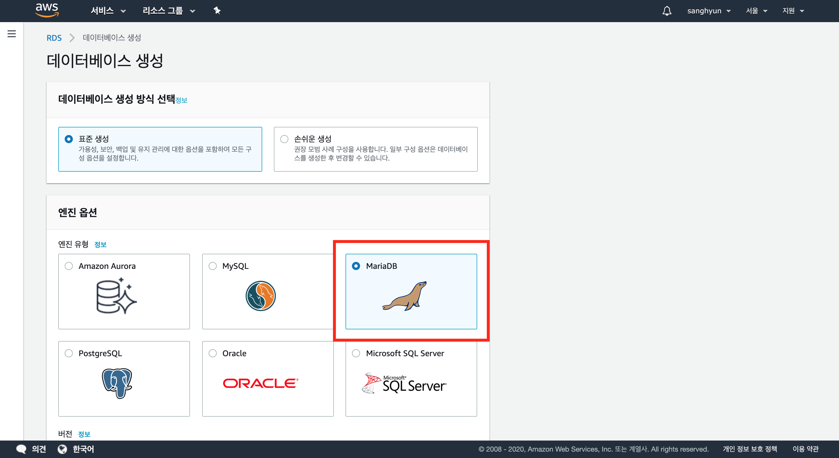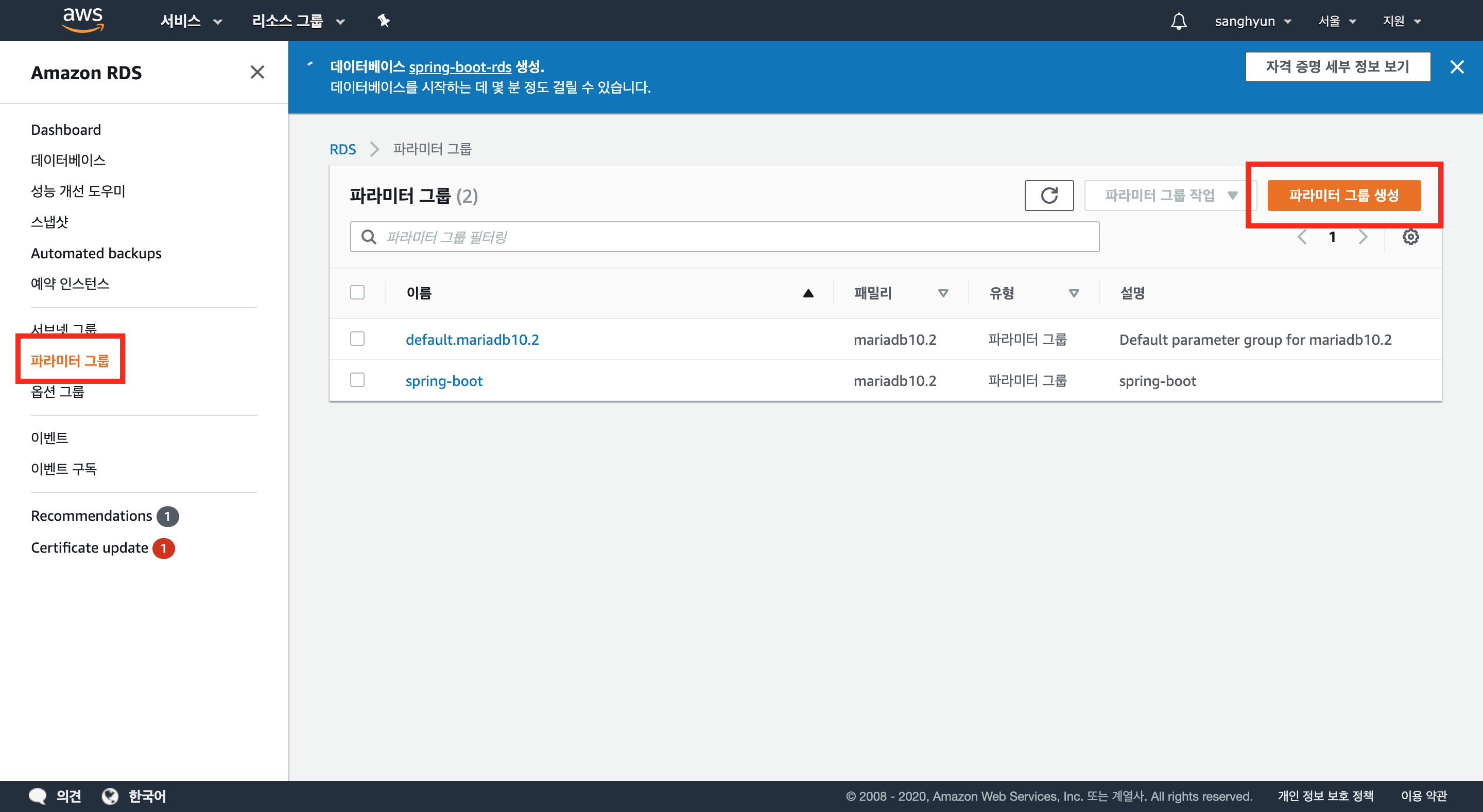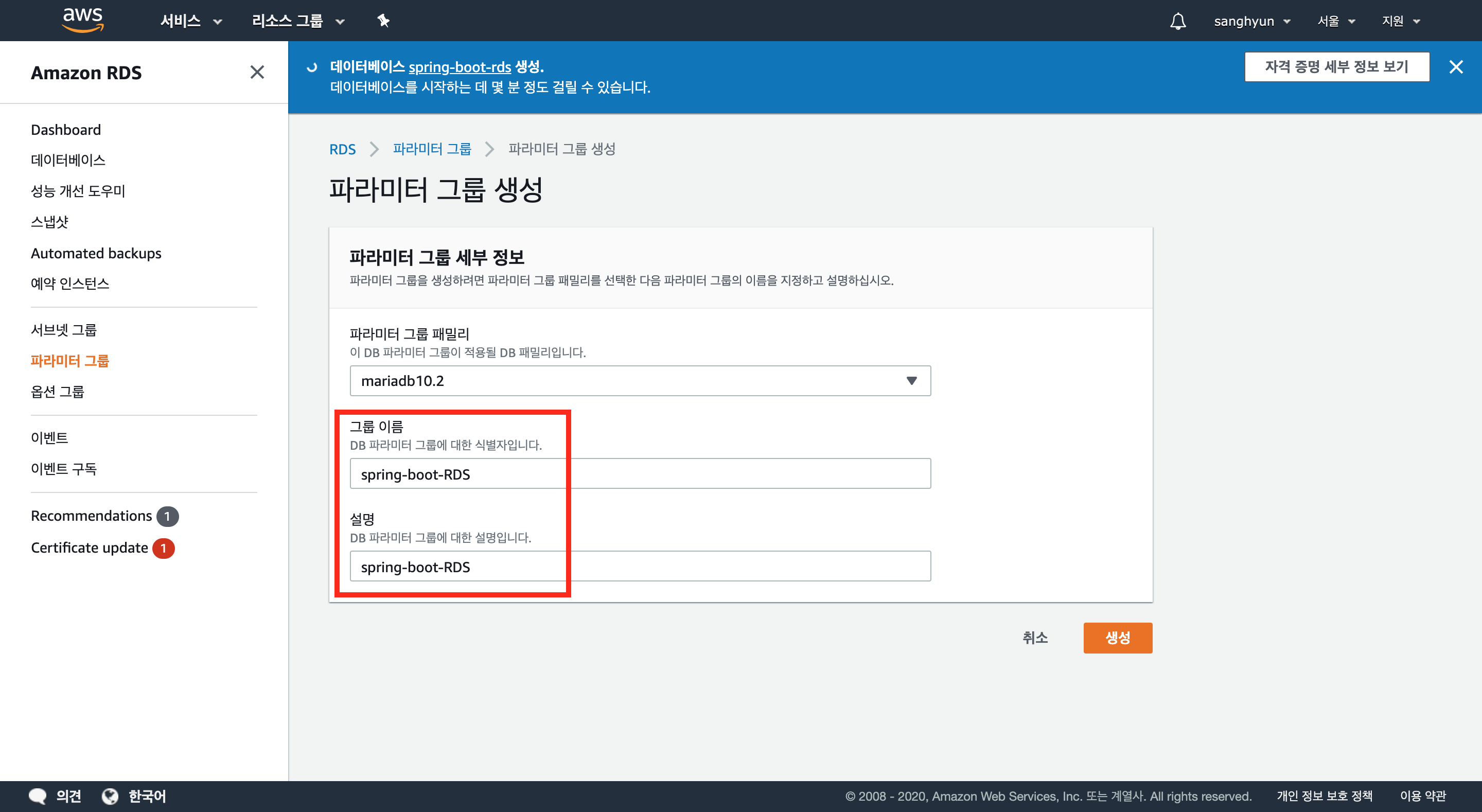 파라미터 그룹 패밀리는 생성한 데이터베이스의 버전과 맞춰주면 된다. 아까 생성할 때 MariaDB 10.2.21으로 생성했으니 변경하지 않아도 된다. 아래 그룹 이름과 설명을 적고 다음으로 넘어간다.