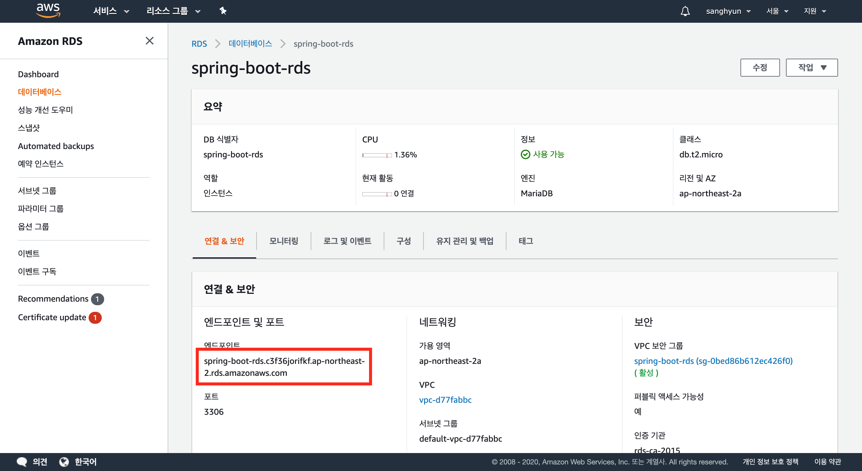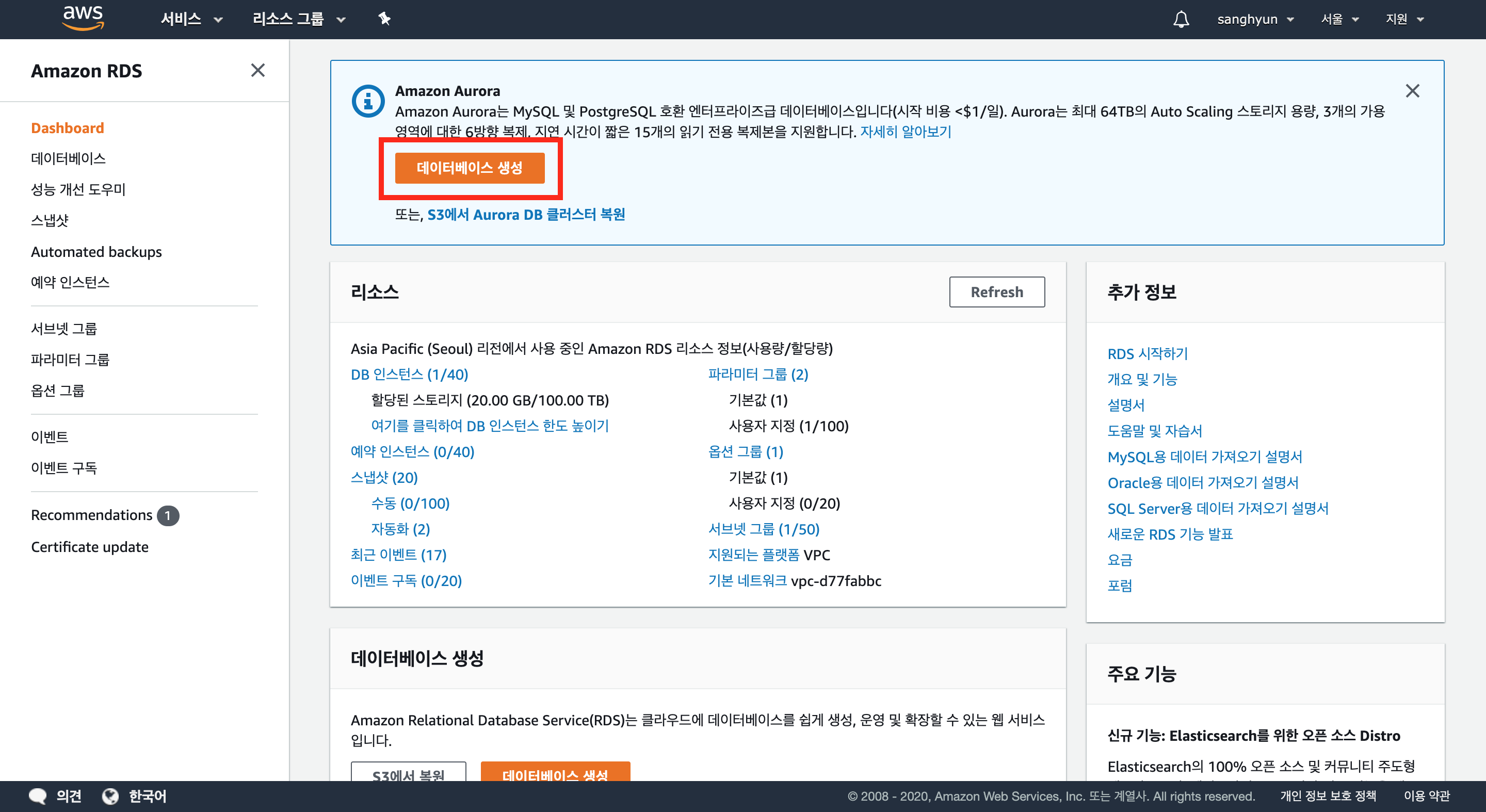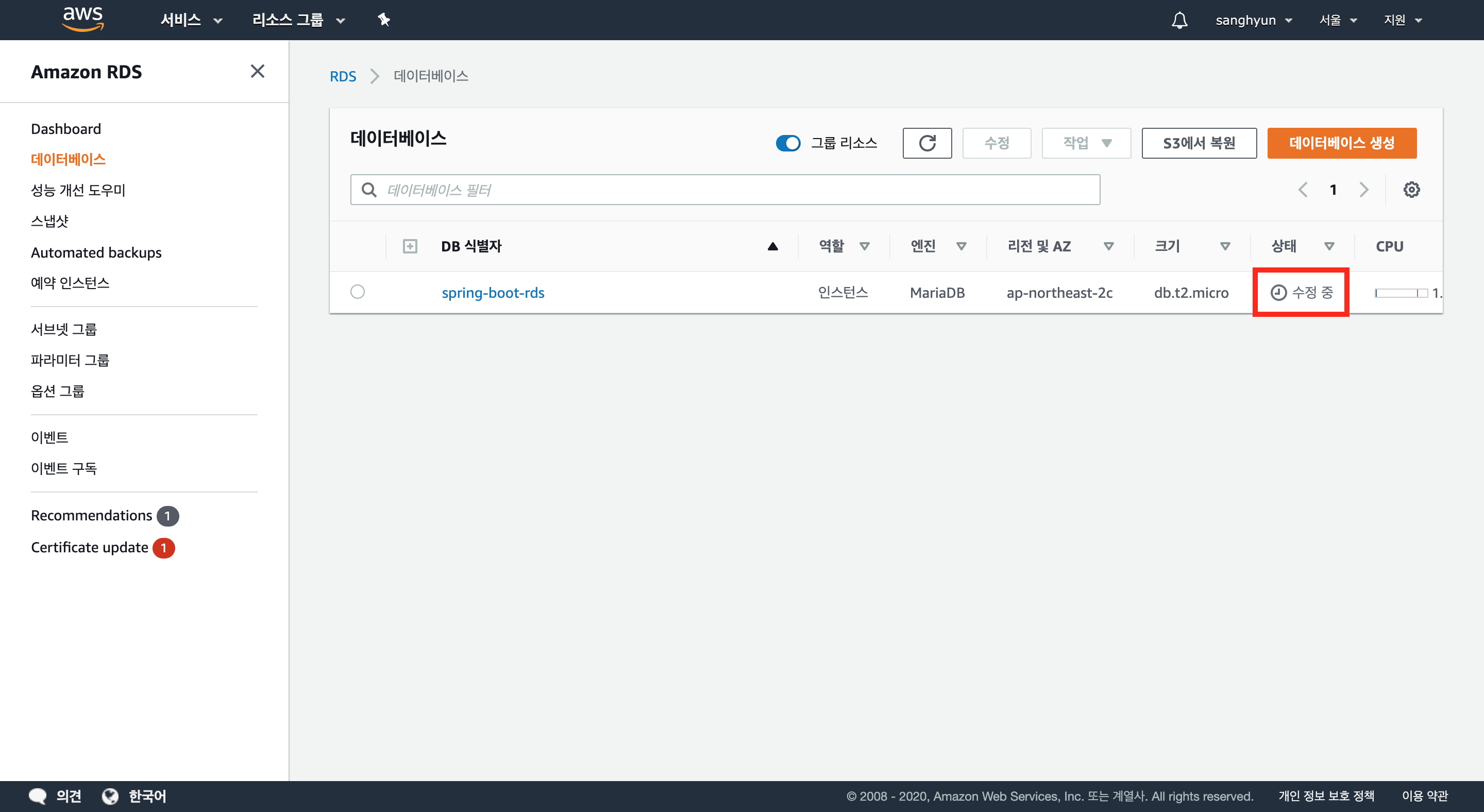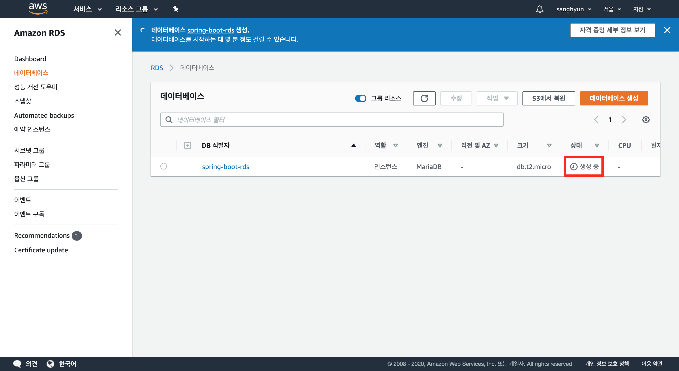 데이터베이스 대시보드에서 [생성 중]이라고 표시되면 정상적으로 생성이 된 것이다.