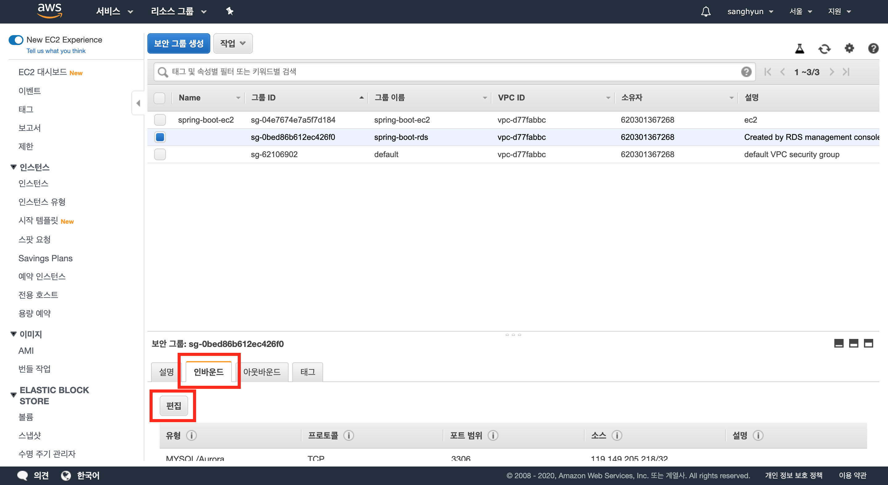RDS 보안 그룹의 [인바운드]를 눌러 [편집] 버튼을 눌러준다.