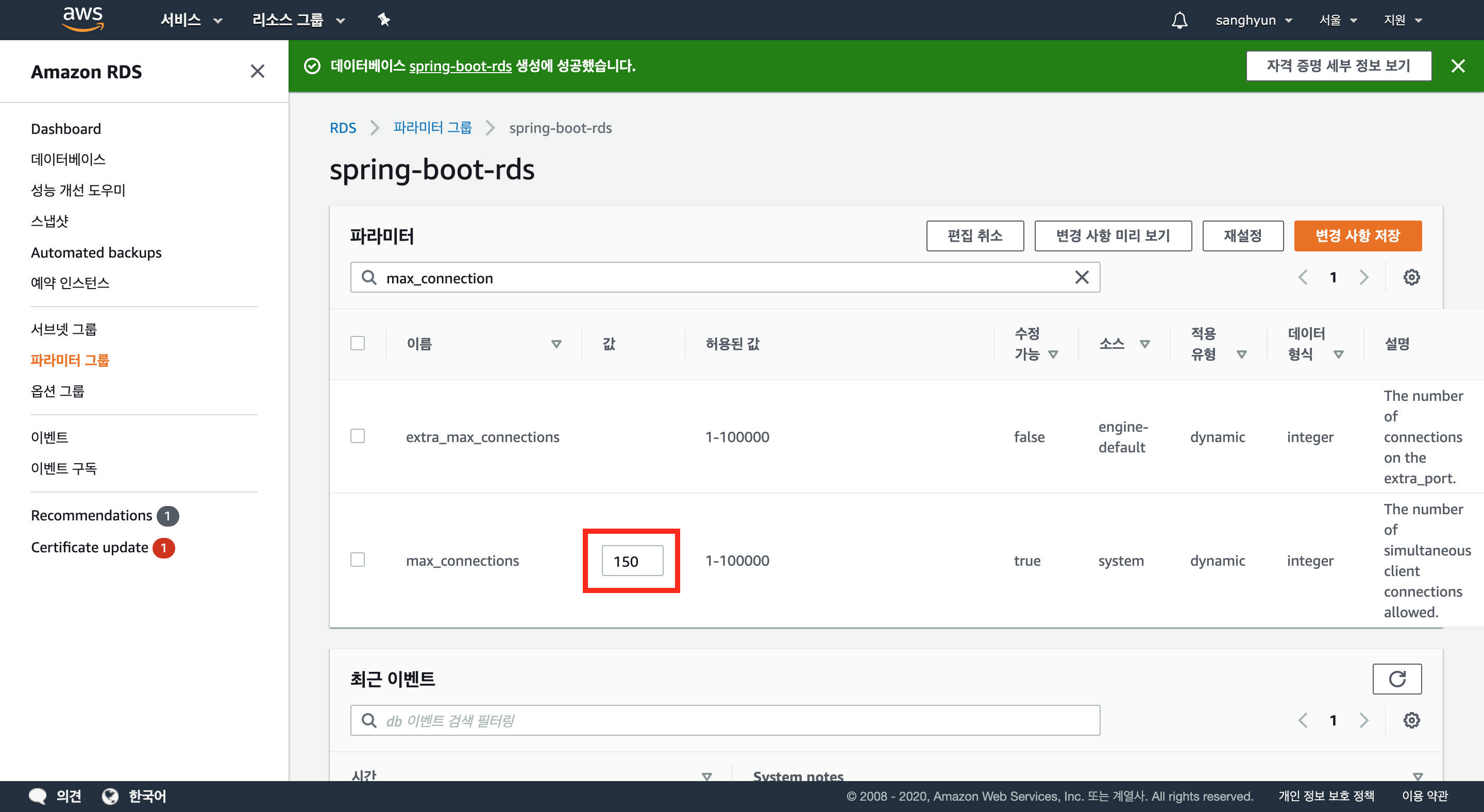 마지막으로 Max Connection 값을 변경한다. RDS의 Max Connection은 인스턴스 사양에 따라 자동으로 정해진다. 현재 프리티어 사양으로는 약 60개의 커넥션만 가능해서 좀 더 넉넉한 값으로 지정해준다.