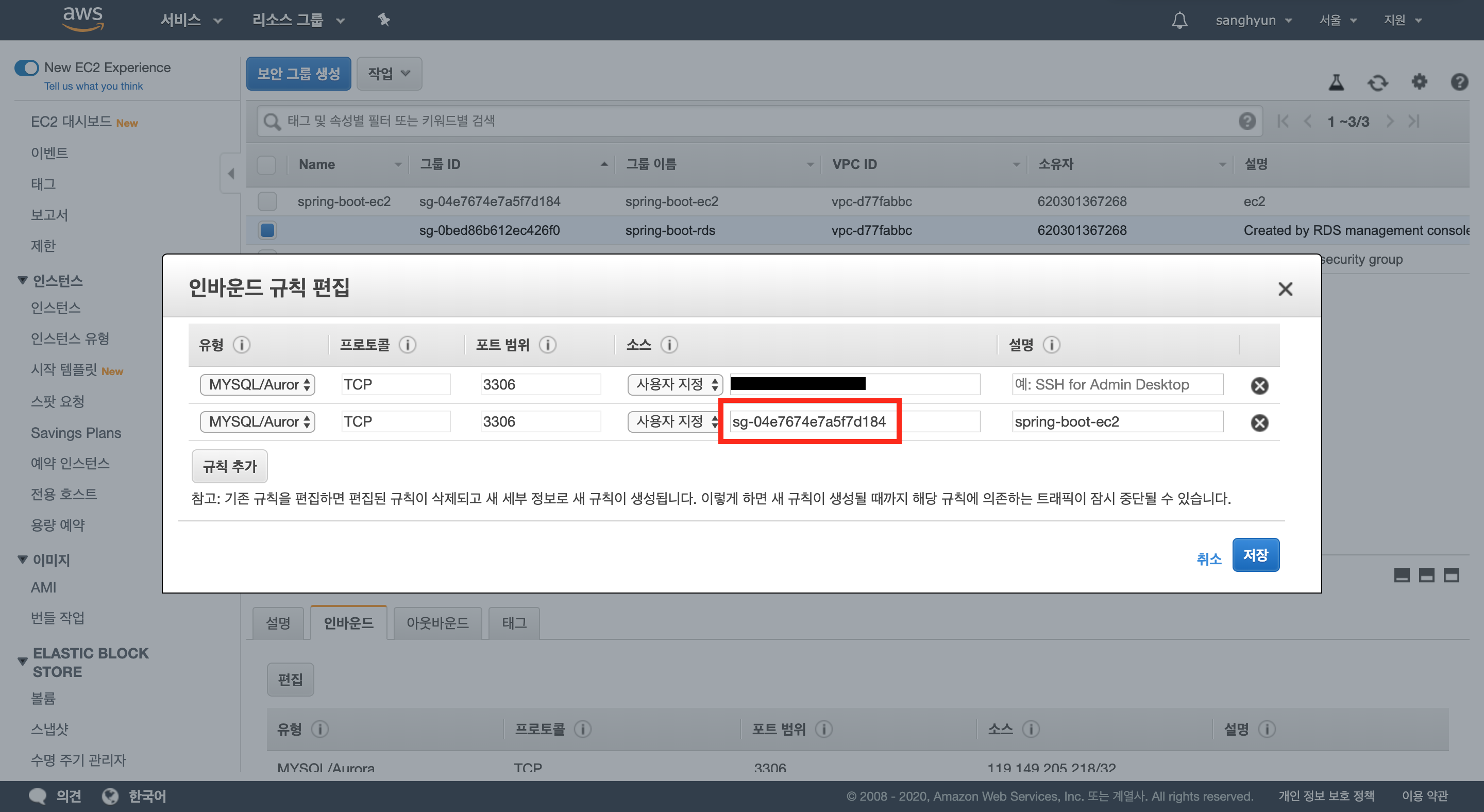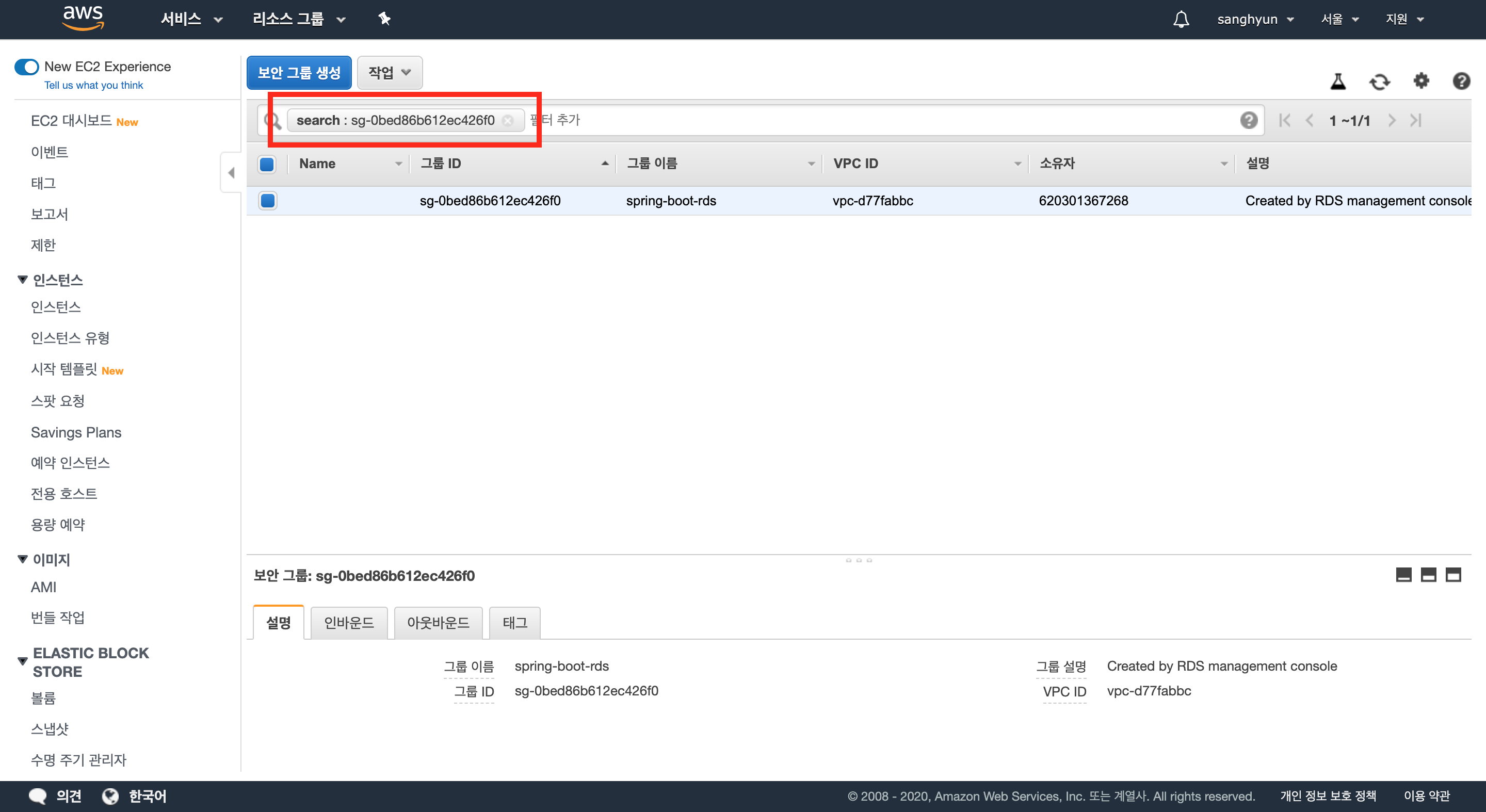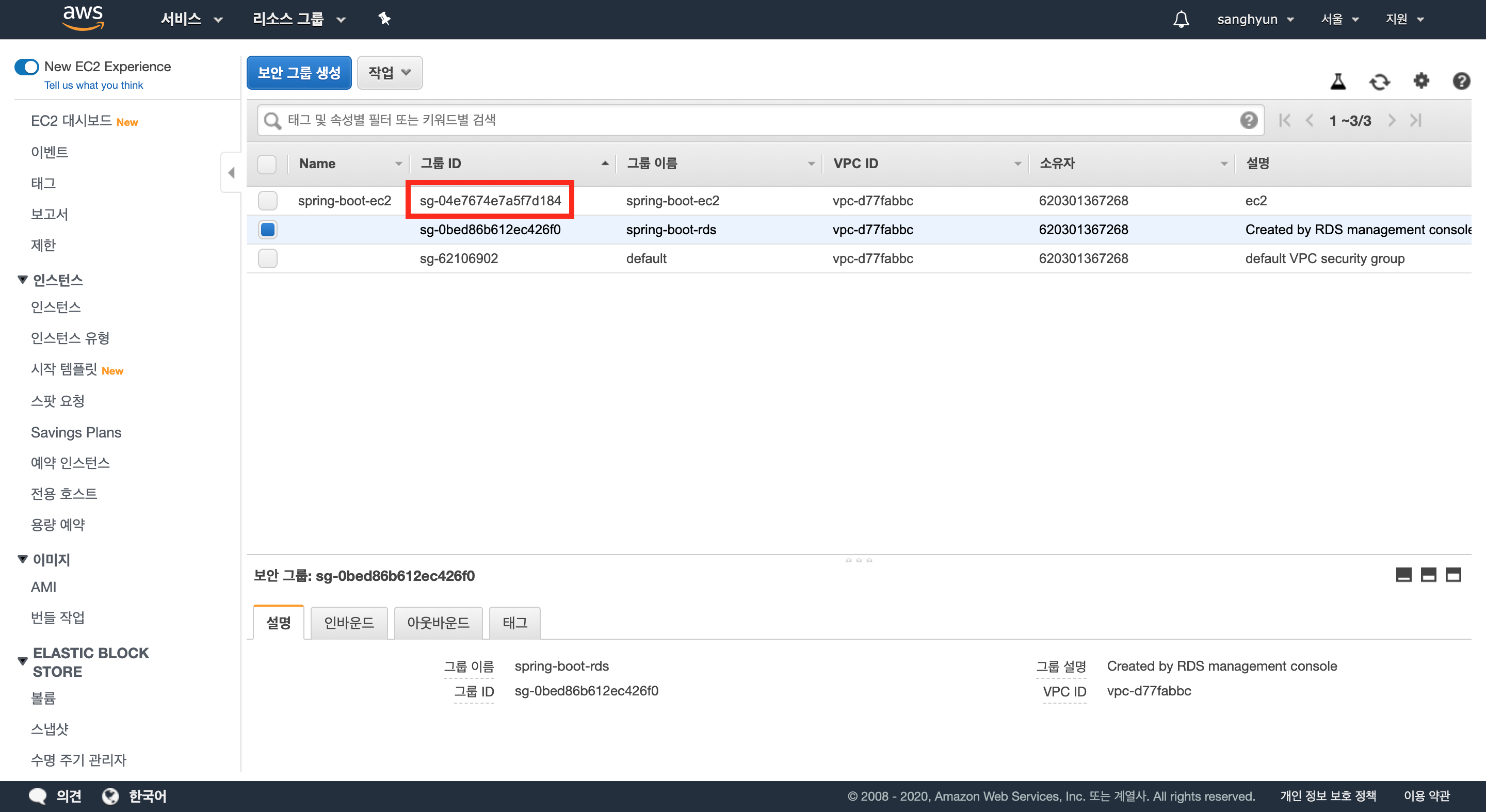 이전에 만들었던 EC2 보안 그룹의 그룹 ID를 복사해준다.