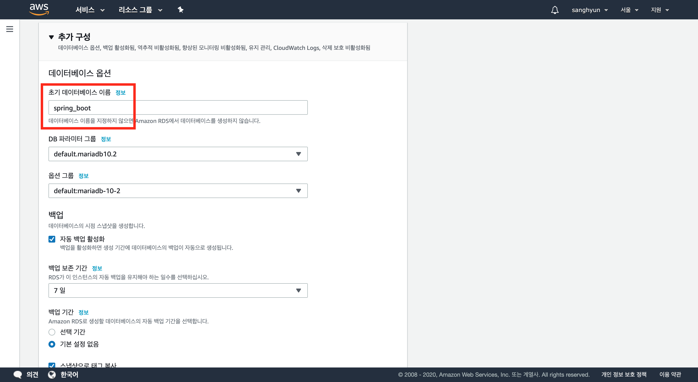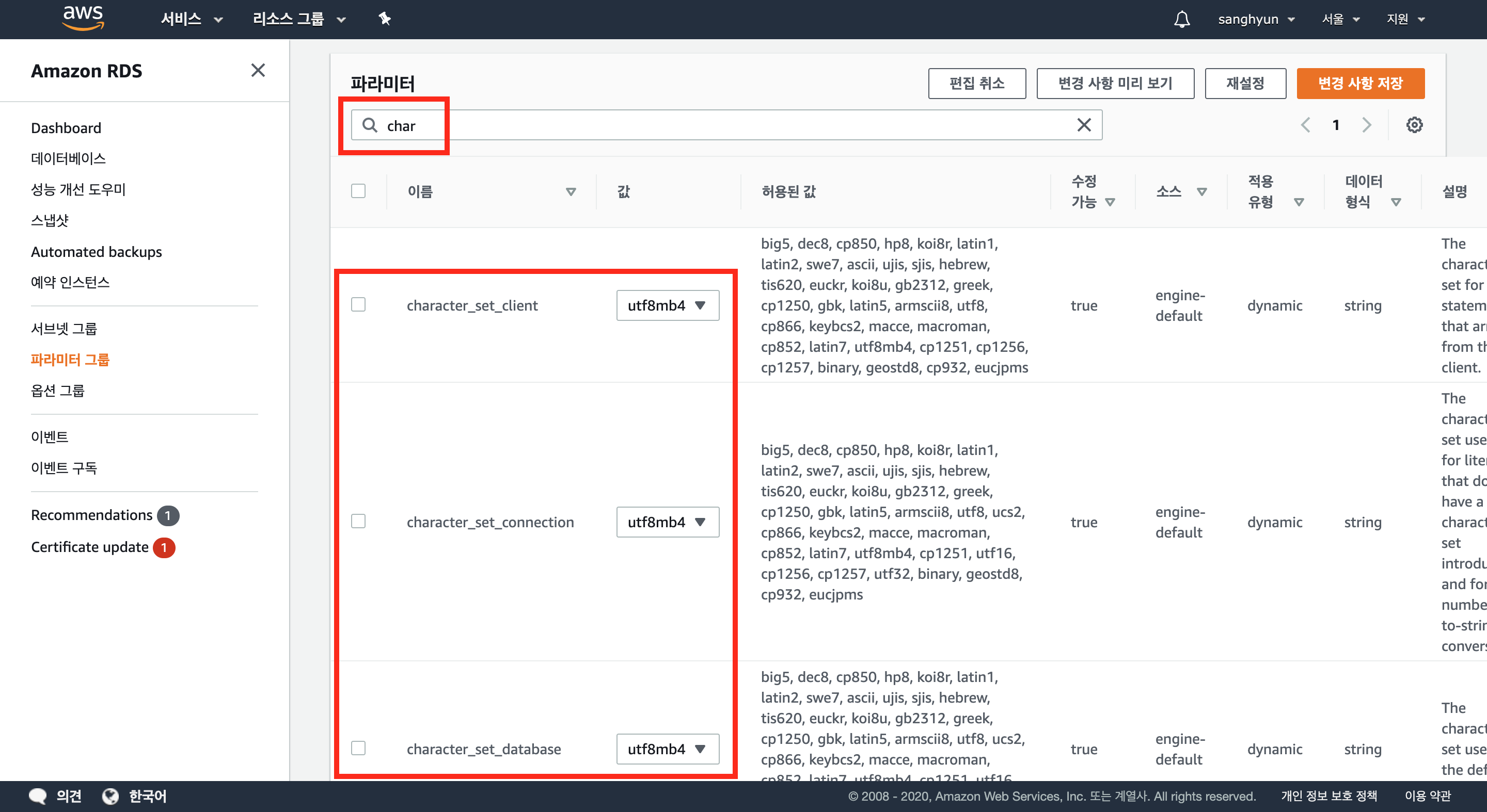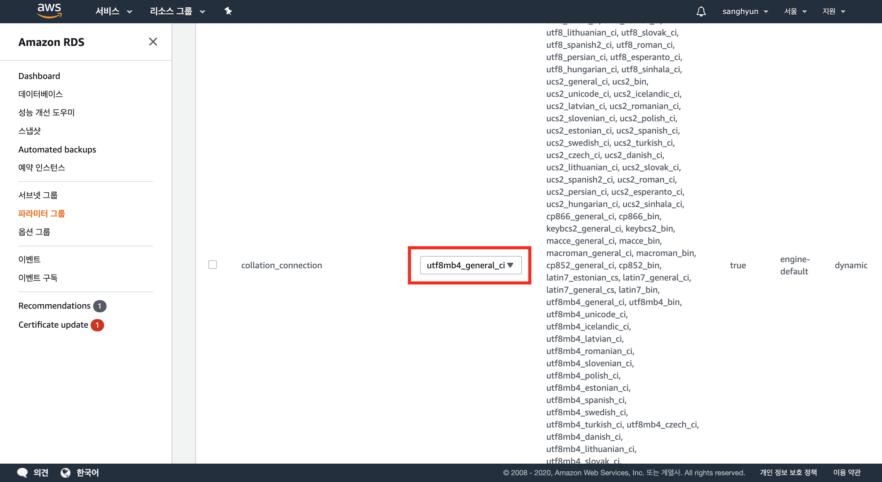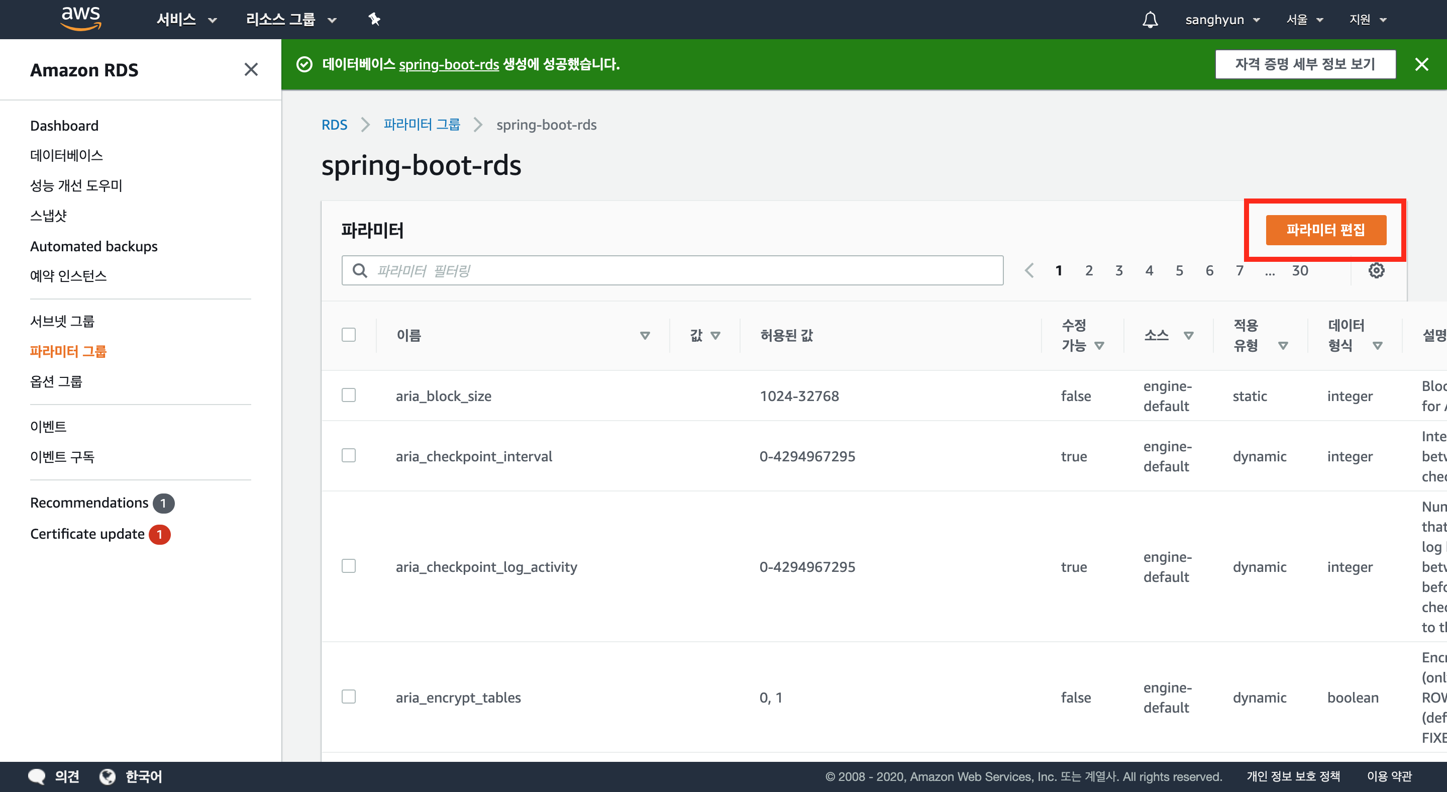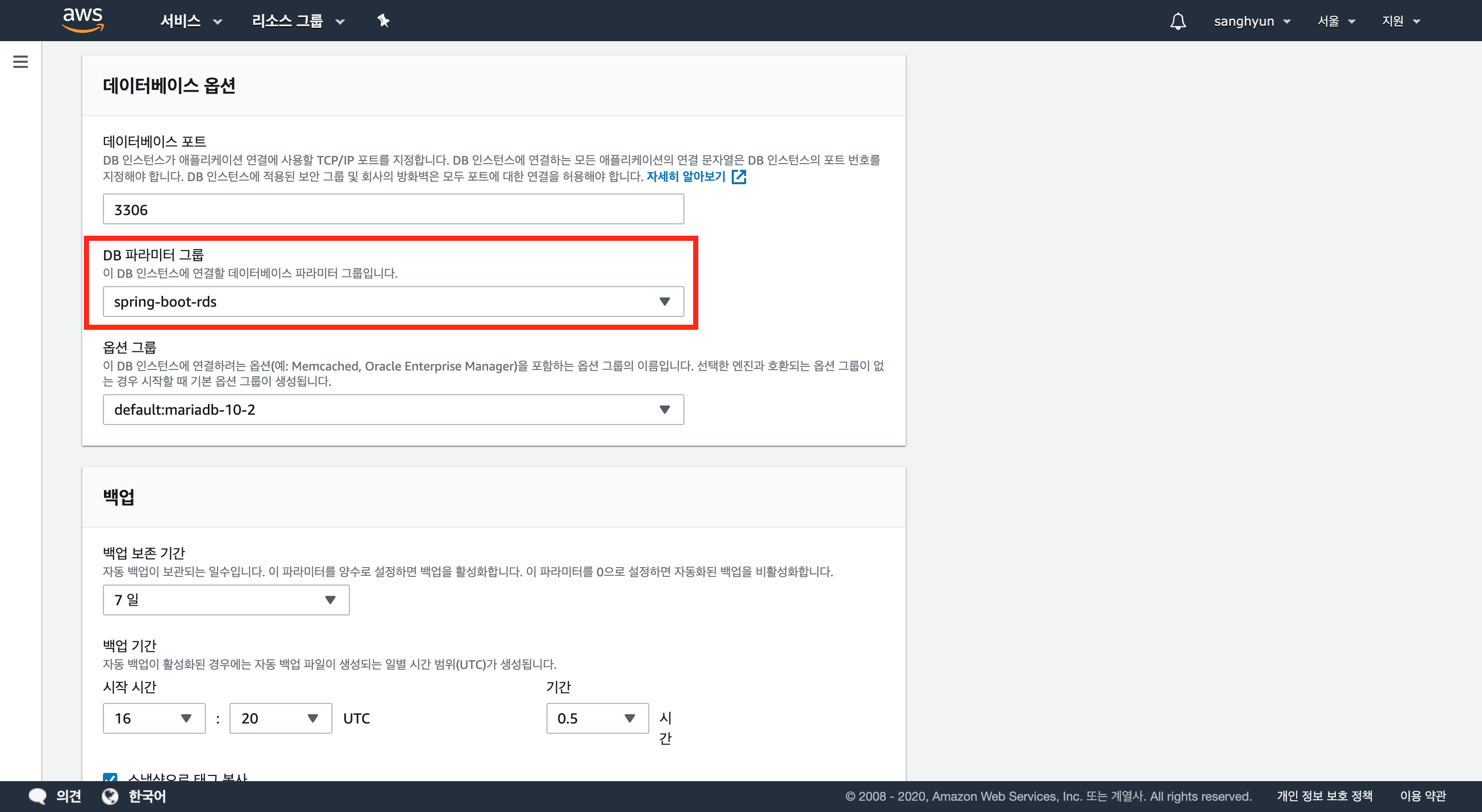 [데이터베이스 옵션] 화면에서 DB 파라미터 그룹을 방금 생성한 신규 파라미터 그룹으로 변경한다.