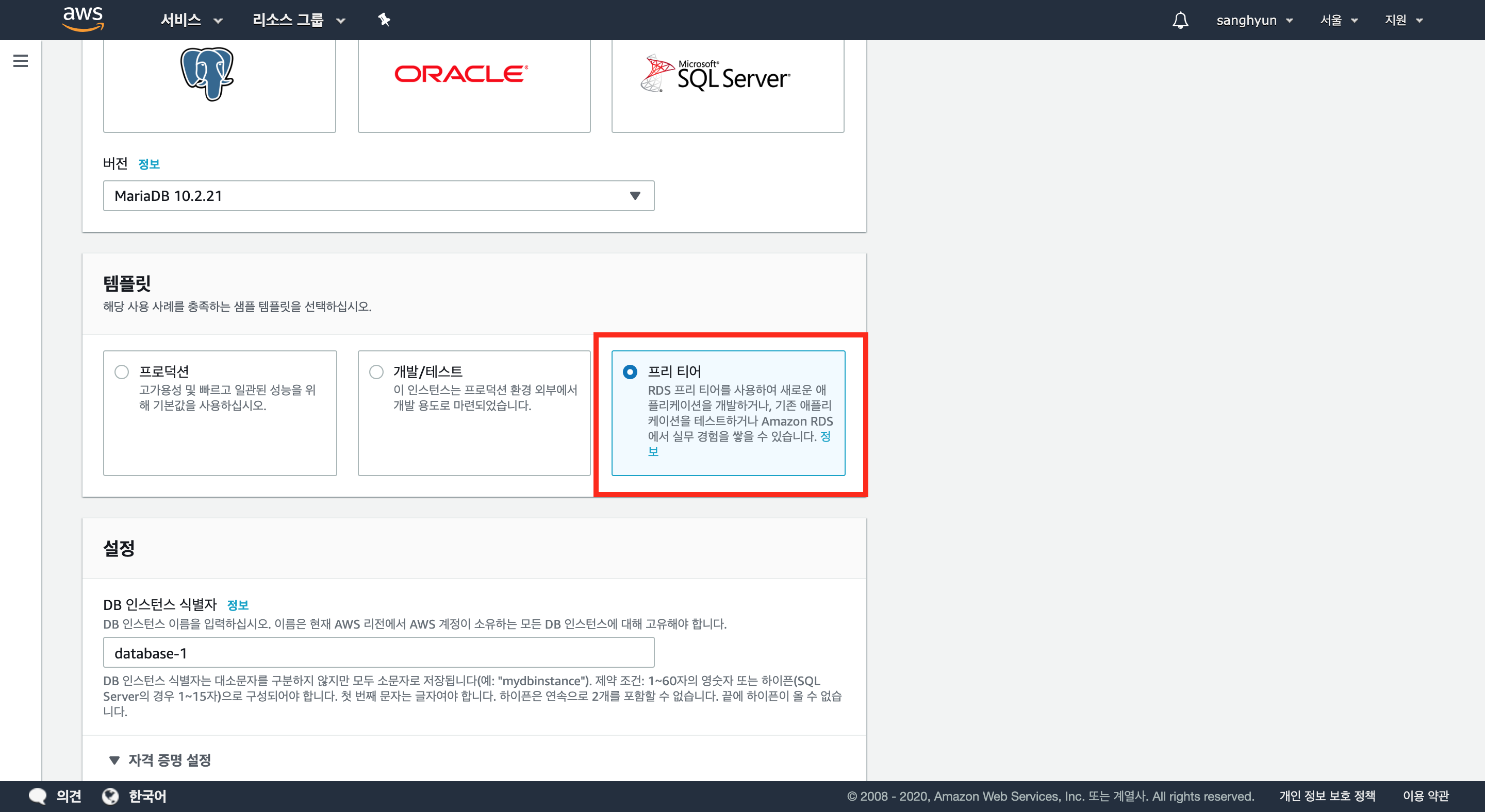 현재는 프리 티어를 이용중이니 프리 티어를 선택해준다.