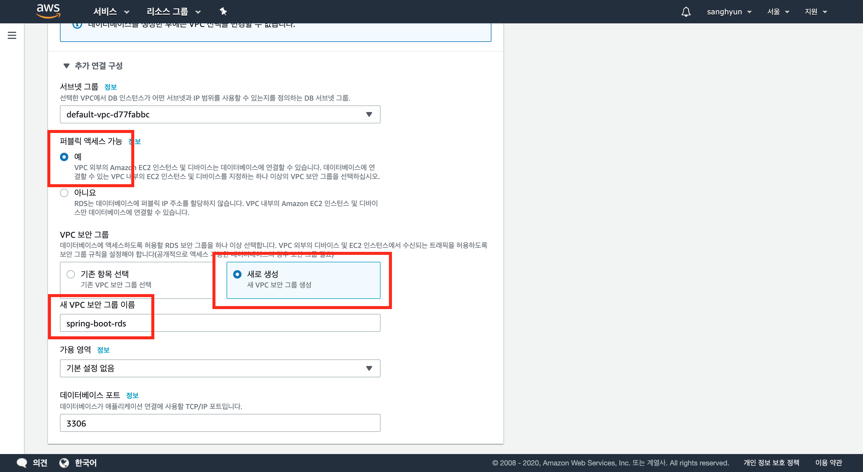 연결 부분에서는 [추가 연결 구성] 버튼을 누른 후, 퍼블릭 엑세스를 [예]로 변경한다. 이후 보안 그룹에서 지정된 IP만 접근하도록 막을 예정이다. 또한 VPC 보안 그룹에서 [새로 생성] 버튼을 누르고 이름을 적어준다.