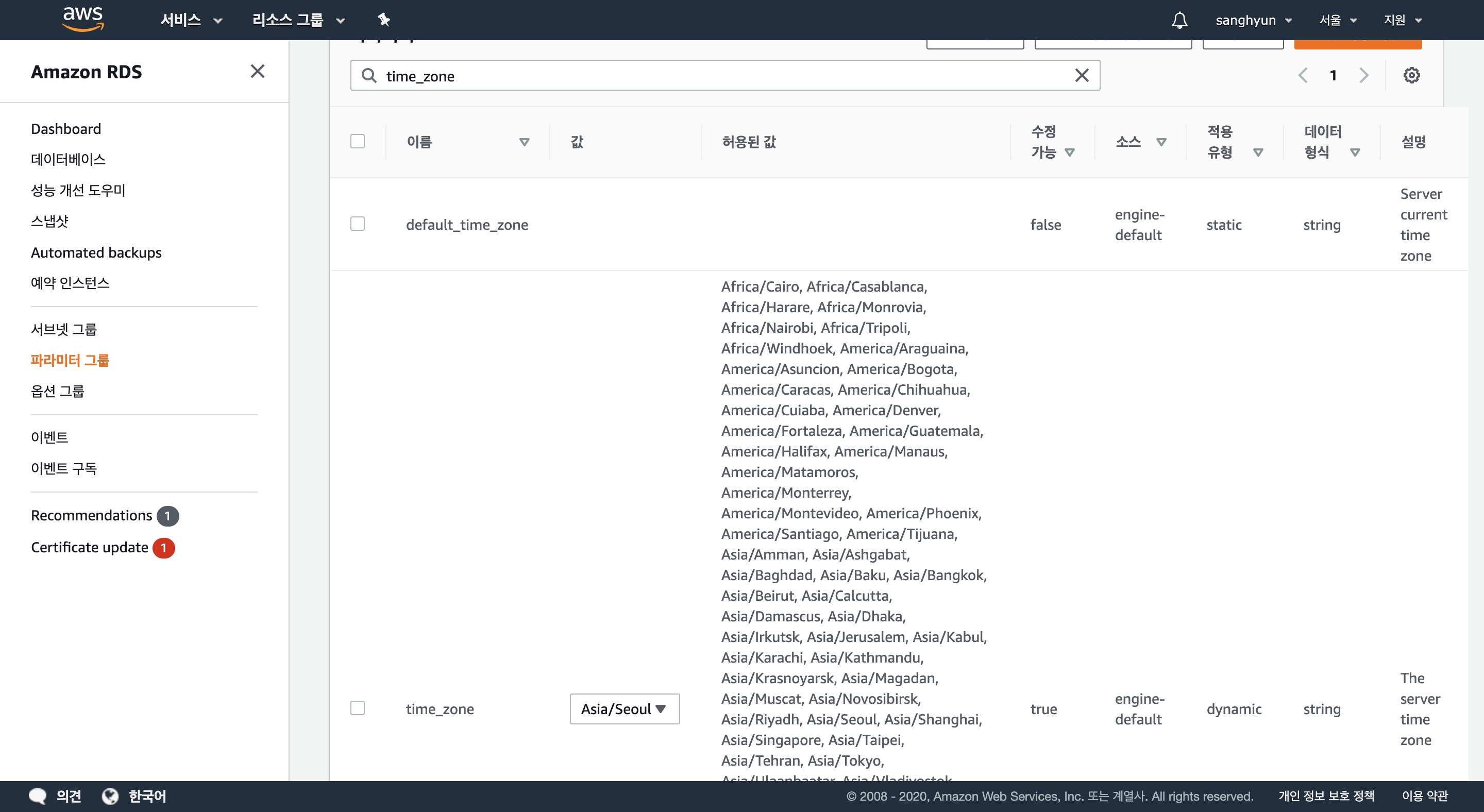 검색창에 time_zone을 검색하여 time_zone 파라미터를 Asia/Seoul로 변경해준다.