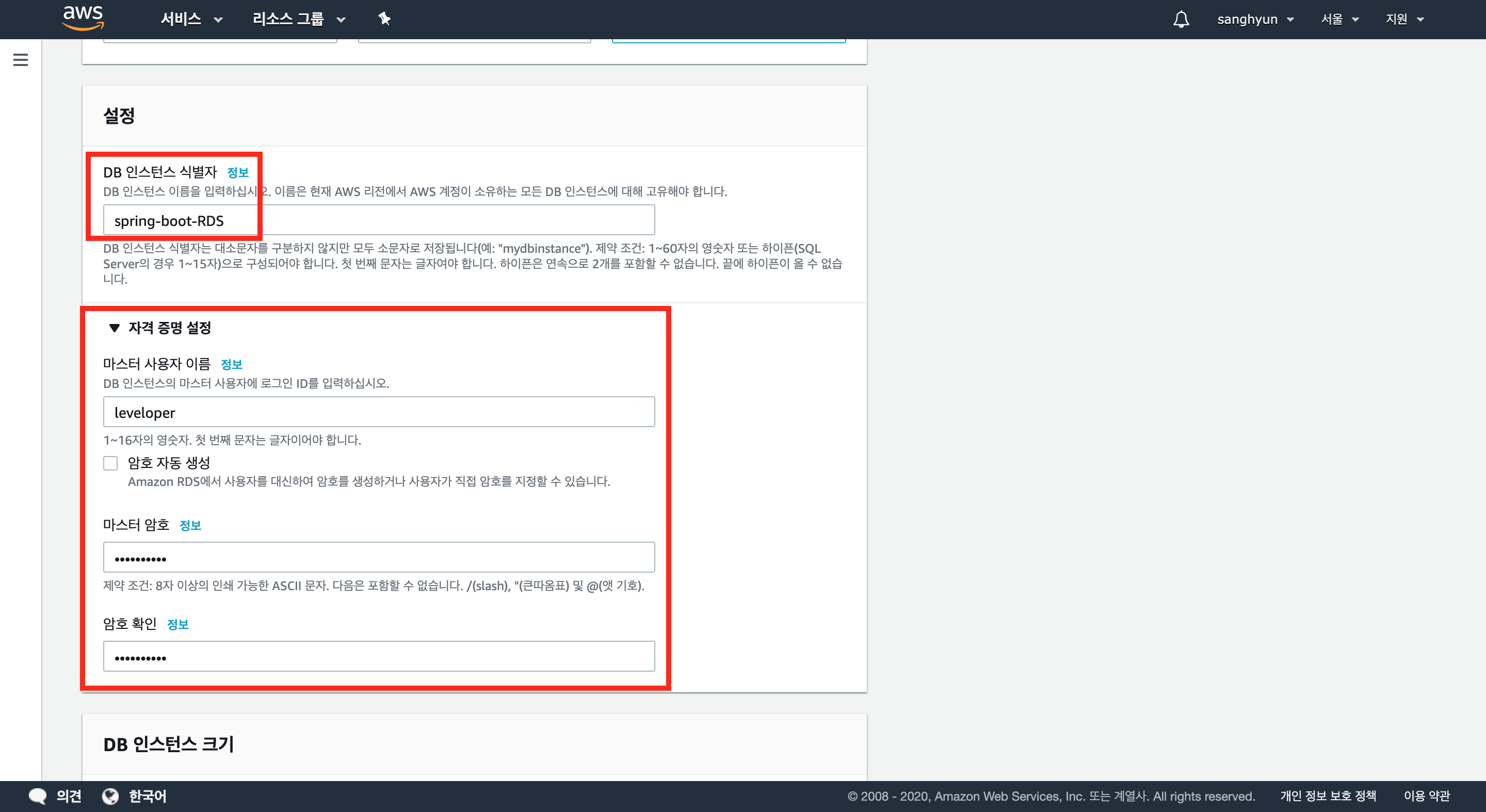 다음은 DB 인스턴스와 마스터 사용자 정보 등록 화면이다. 식별자와 이름 및 암호를 적어준다.