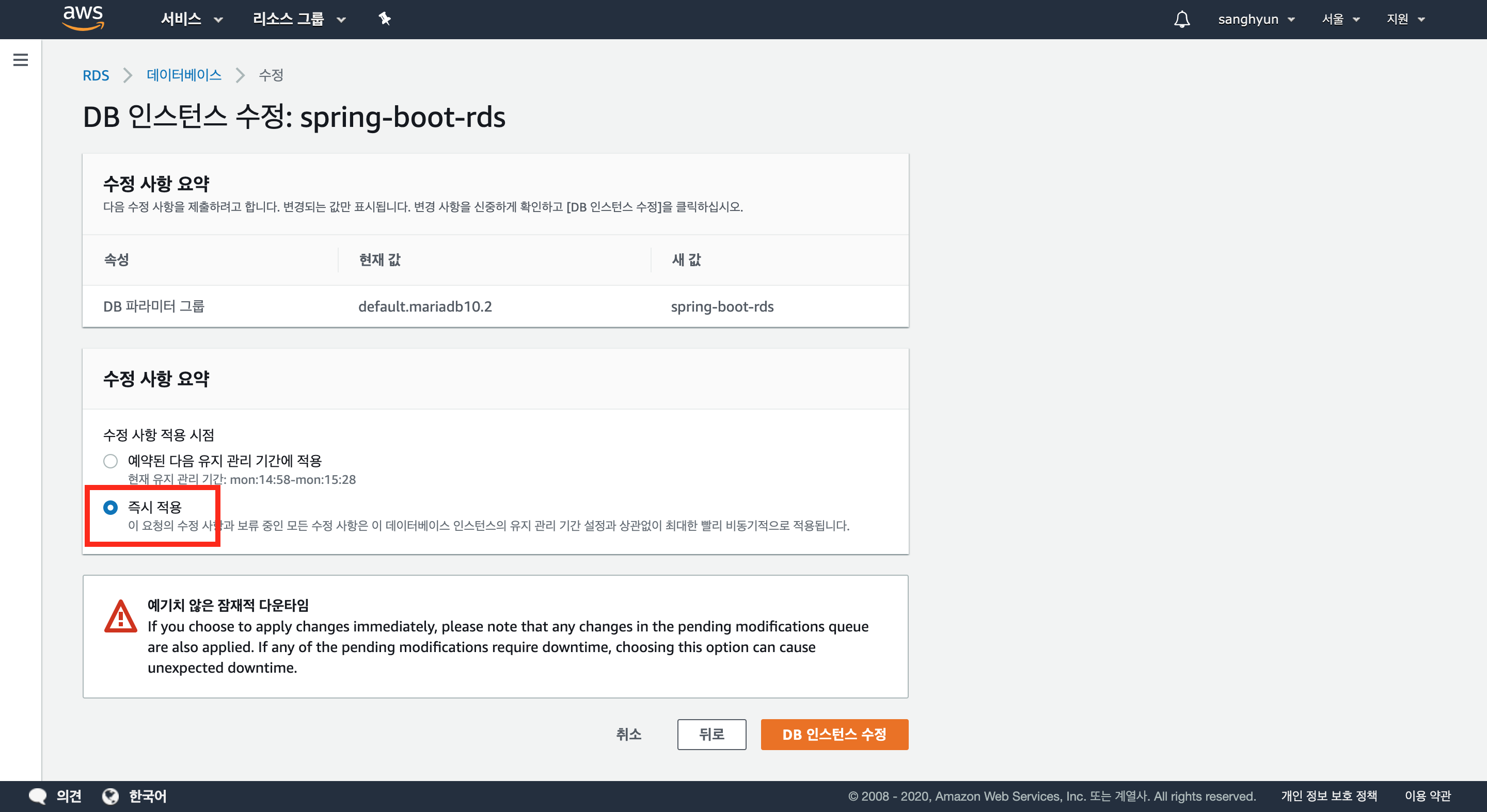 최하단의 [계속] 버튼을 누르면 다음과 같이 수정 사항이 요약된 것을 볼 수 있다. 여기서 반영 시점을 [즉시 적용]으로 한다. 예약된 다음 유지 시간으로 하면 지금 하지 않고, 새벽 시간대에 진행하게 된다. 이 수정사항이 반영되는 동안 데이터베이스가 작동하지 않을 수 있으므로 예약 시간을 걸어두라는 의미지만, 지금은 서비스가 오픈되지 않았기 때문에 즉시 적용을 해준다.