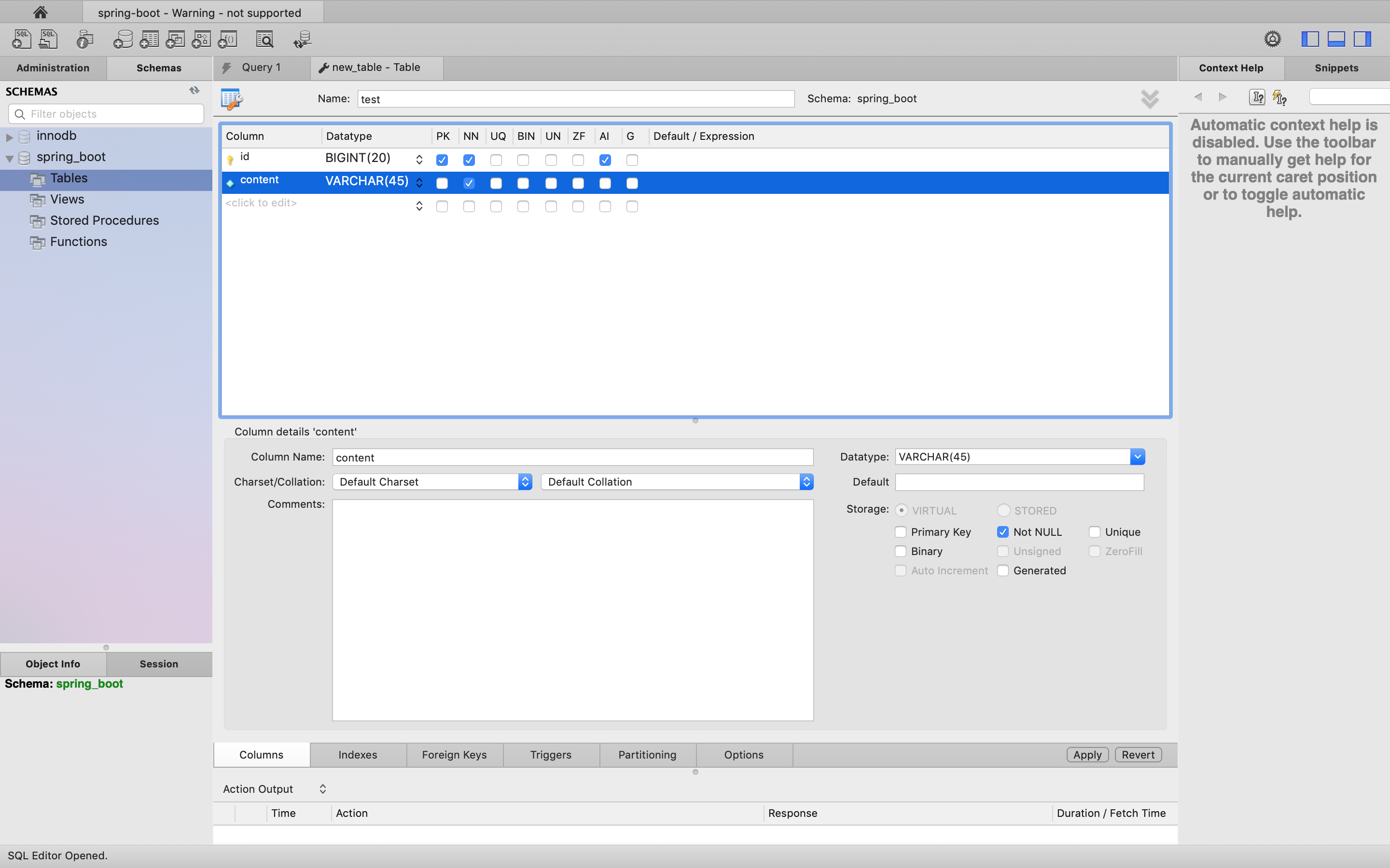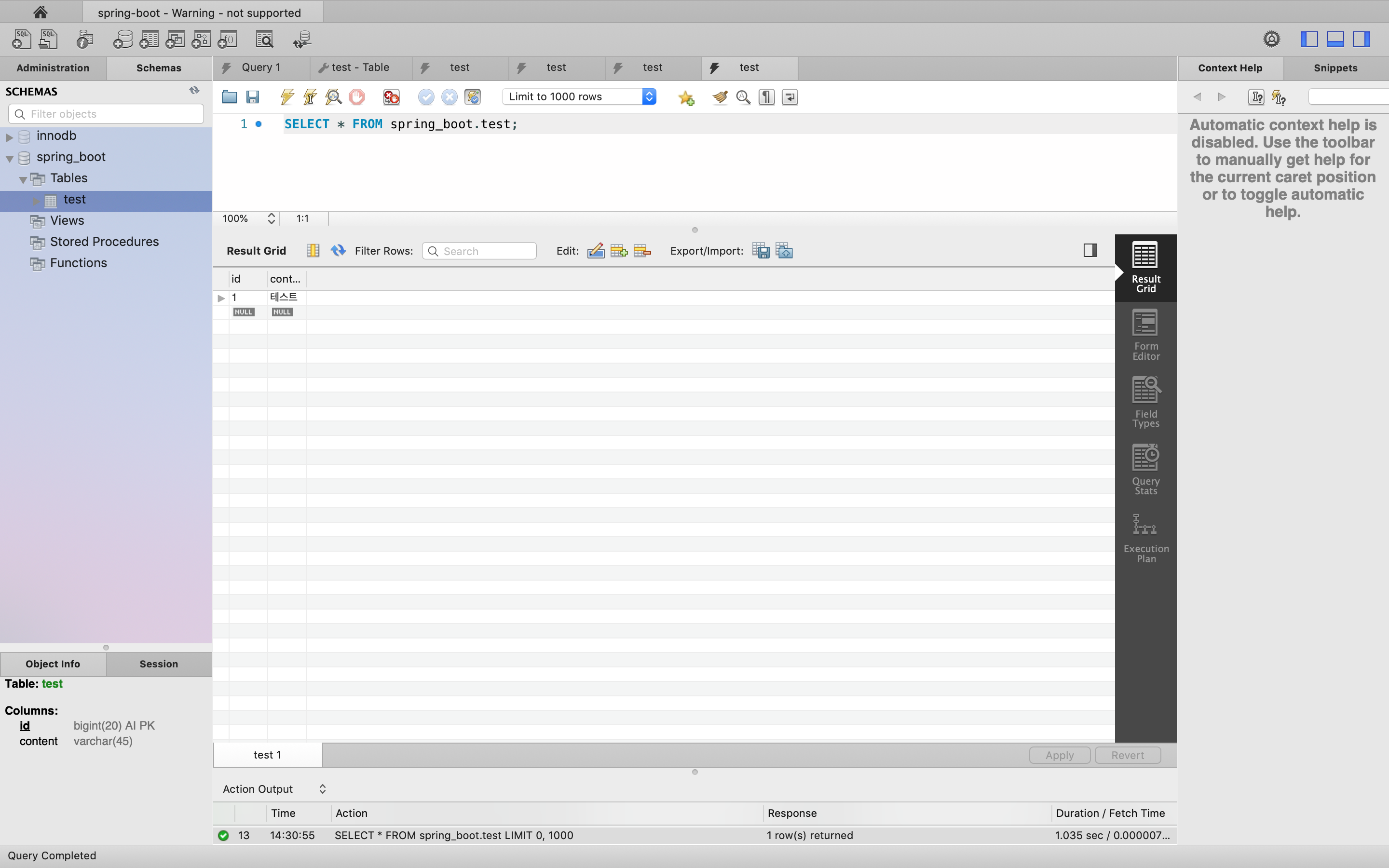 이제 접속에 성공했으니 간단한 테이블을 만들고 데이터를 삽입해본다. 간단하게 id와 content만 컬럼으로 갖는 test 테이블을 생성한다.