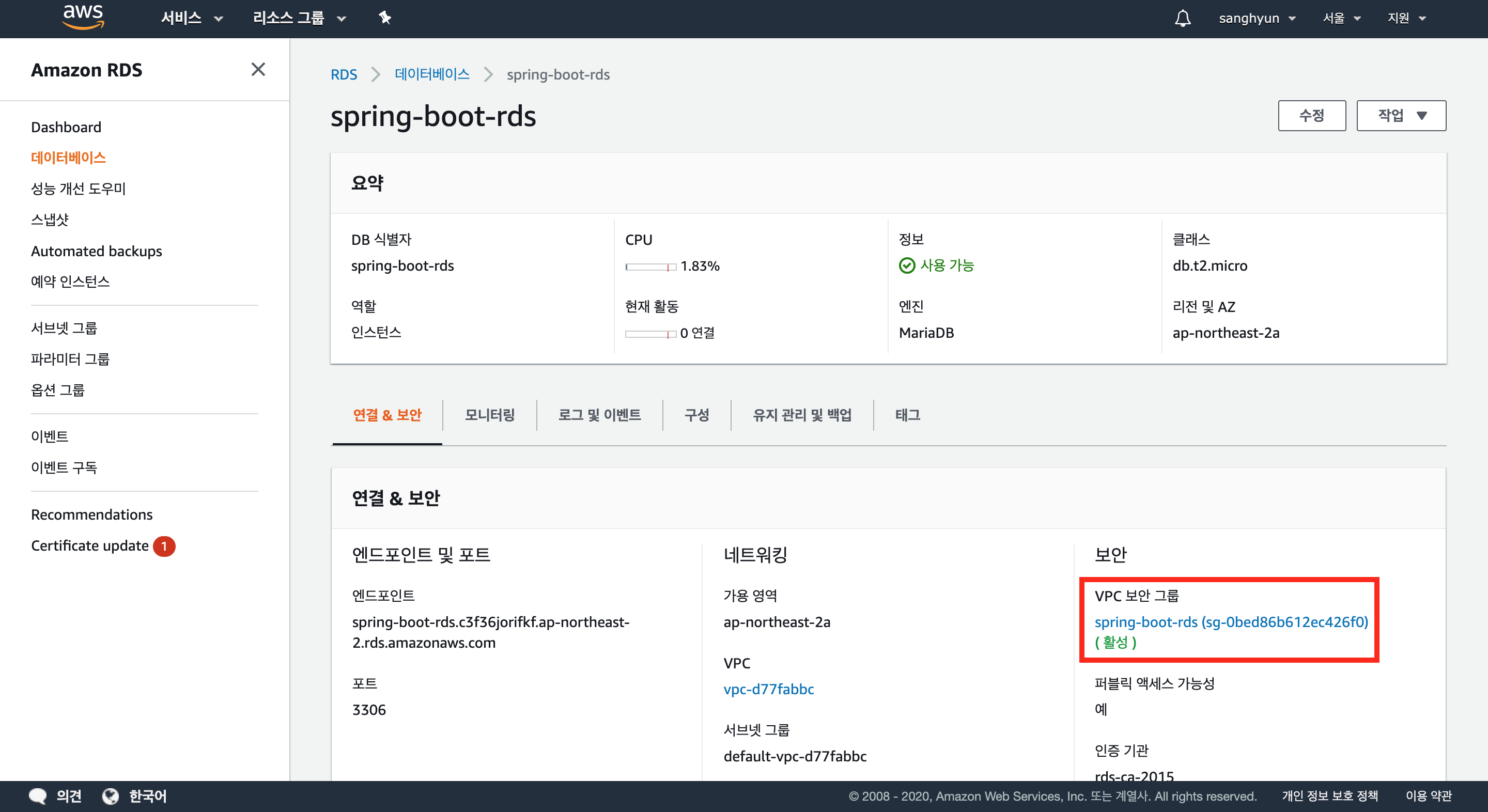 로컬 PC에서 RDS로 접근하기 위해선 RDS의 보안 그룹에 본인 PC이 IP를 추가해야 한다. RDS의 세부 정보 페이지에서 [보안 그룹] 항목을 클릭한다.