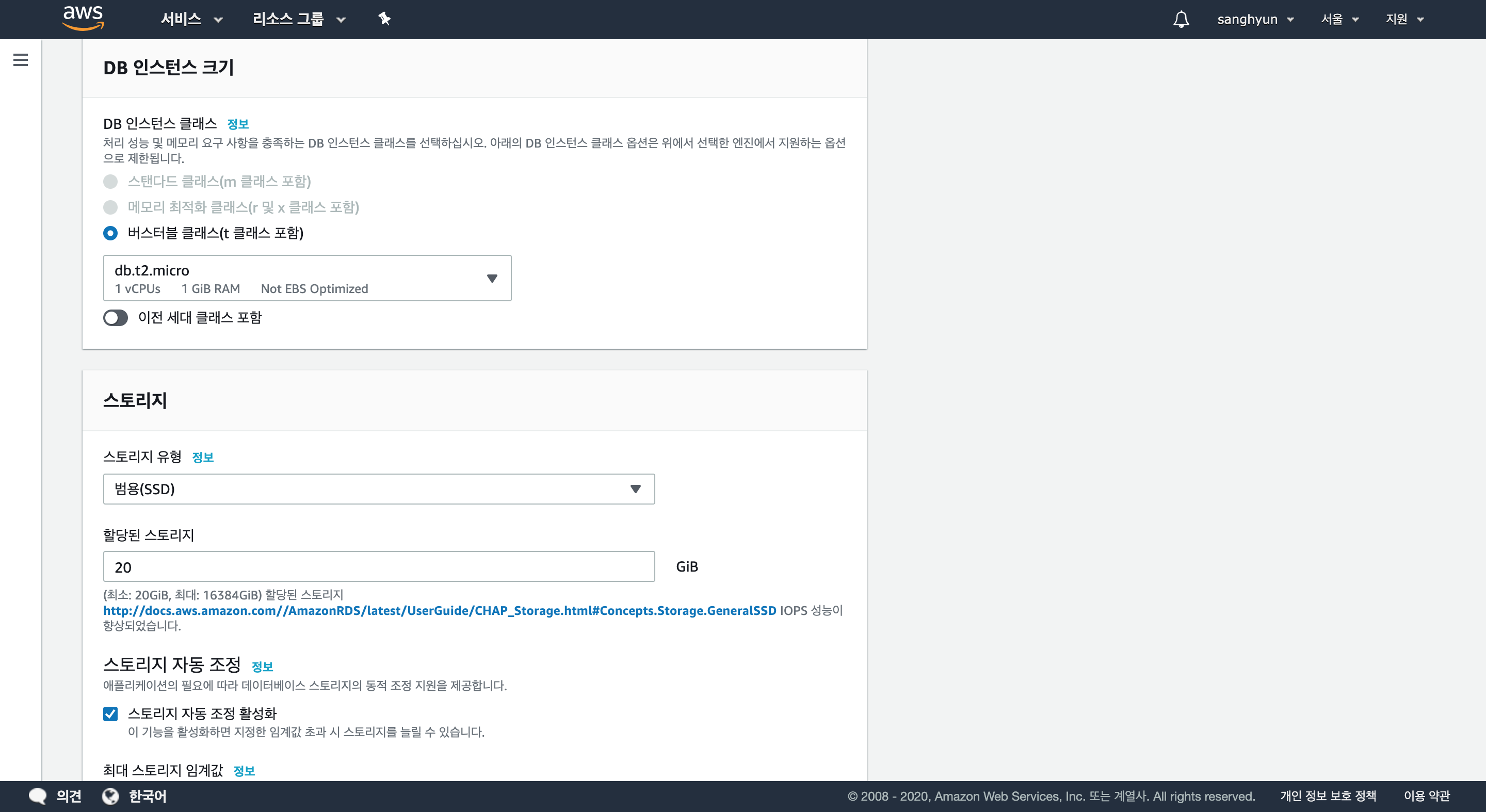 DB 인스턴스 크기와 스토리지는 변경사항이 없으니 그냥 넘어간다.