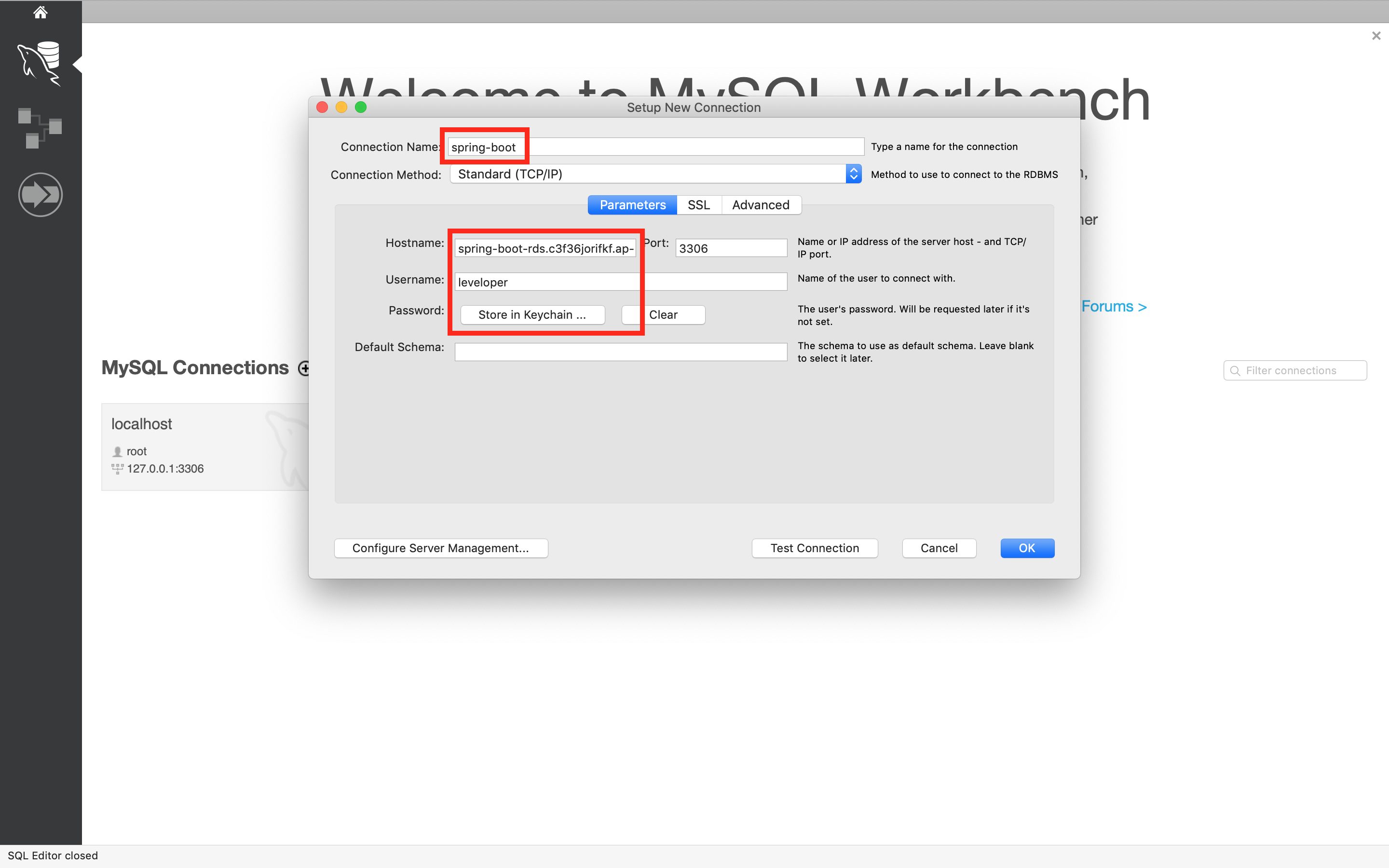 Workbench를 열어서 [Setup New Connection]을 눌러준다. 여기서 Hostname은 두 번째 사진에 있는 RDS의 엔드포인트이다. Username과 Password까지 입력해준 뒤 OK 버튼을 누른다.