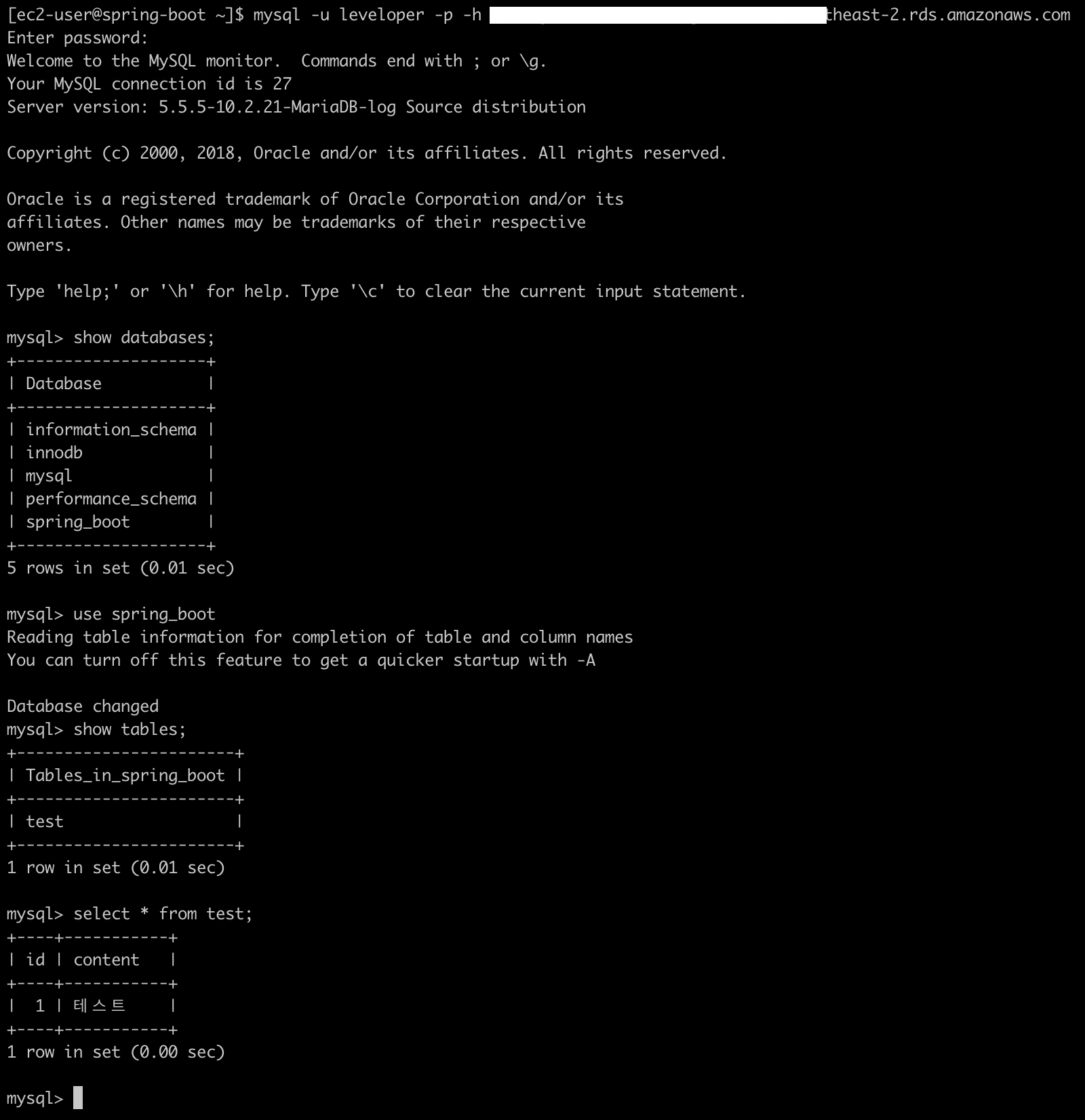설치가 다 되었다면 로컬에서 접근하듯이 계정, 비밀번호, 호스트 주소를 사용해 RDS에 접속한다. 패스워드를 입력하라는 메시지가 나오면 패스워드까지 입력한다.