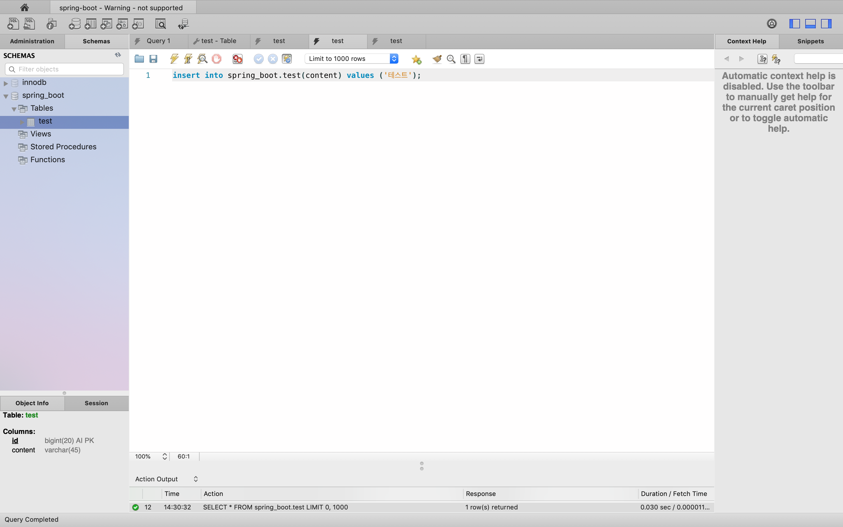 이제 접속에 성공했으니 간단한 테이블을 만들고 데이터를 삽입해본다. 간단하게 id와 content만 컬럼으로 갖는 test 테이블을 생성한다.