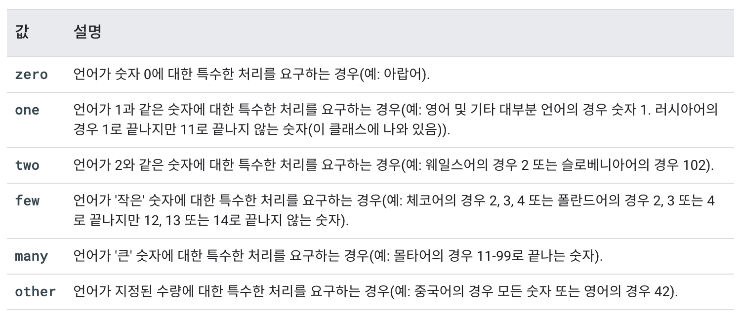 quantity를 설정할 때는 주의할 점이 있습니다. plurals는 언어마다 숫자에 대한 표현이 문법적으로 다른 경우에만 사용 가능합니다. 다시 말하자면 단순한 if문과 같은 방식이 아닙니다. 스택오버플로우의 한 답변에 따르면 이는 Unicode Common Locale Data Repository(CLDR)라는 체계를 따르는 겁니다. 논리의 개념이 아닌 인간의 언어에 대한 개념으로 만들어진 체계라고 합니다.