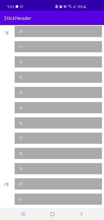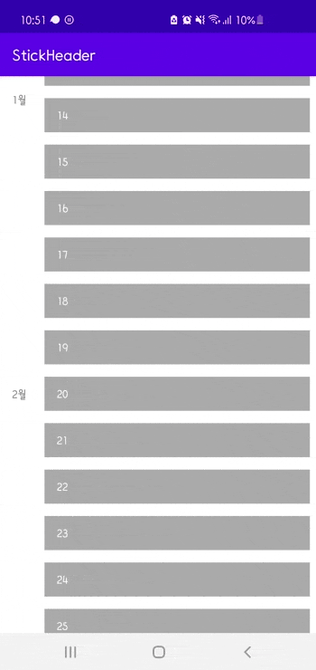 위의 gif를 보면 이 방법을 좀 더 명확하게 파악할 수가 있다. '2월'이 Header에 붙고 좀 더 위로 올리면 '2월'이 분신처럼 쪼개져서 위로 더 올라가는 것을 확인할 수 있다. 이 같은 현상은 RecyclerView에 그려진 뷰와 그 위에 새로 그려진 뷰가 겹쳐지기 때문에 나온다.