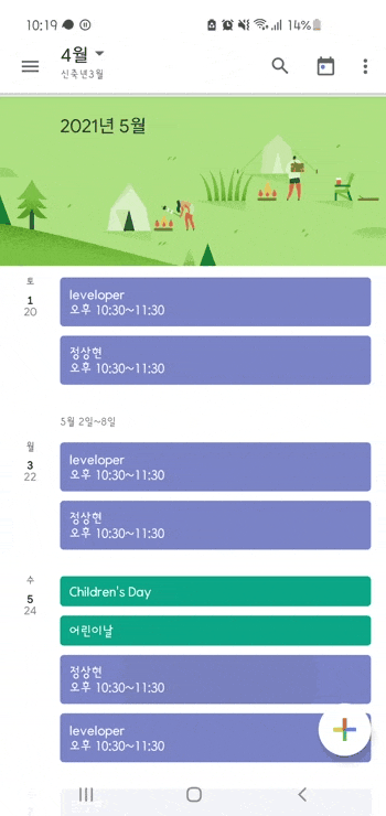 이번 포스팅에는 위와 같은 애니메이션 효과를 구현할 것이다. 위의 구글 캘린더 앱을 보면 왼쪽의 날짜와 요일이 좌측 상단에 고정되어 표시되고 있다. 같은 요일의 일정들이 있으면 좌측의 날짜는 고정이 되고 다음 요일로 지나가게 되면 위로 밀려 올라가는 방식이다.
