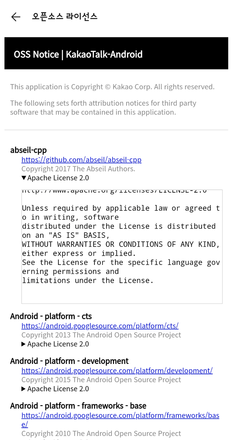 OssLicenseMenuActivity를 시작해주면 오픈소스 라이선스 화면이 나오게 됩니다.