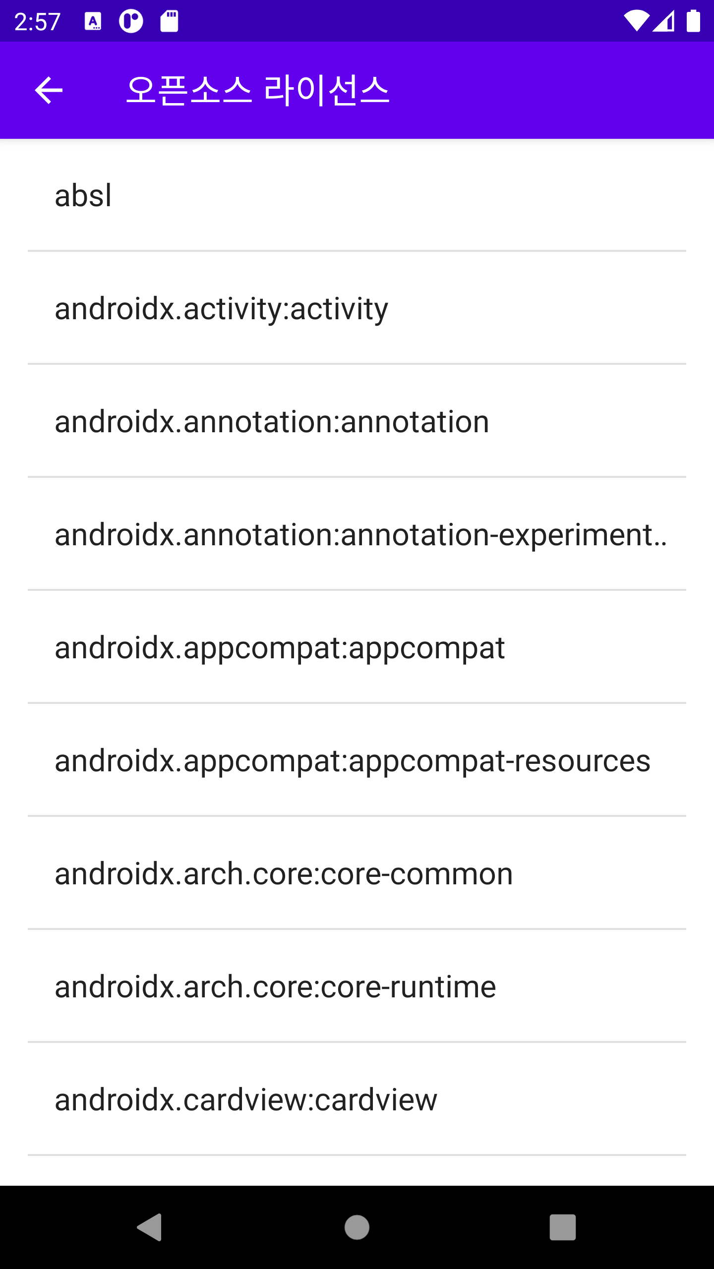 OssLicenseMenuActivity를 시작해주면 오픈소스 라이선스 화면이 나오게 됩니다.