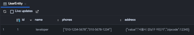 위의 UserEntity 클래스는 User 정보를 지니고 있는 하나의 테이블입니다. UserEntity의 필드로는 name, phones, address 등의 다양한 필드가 정의되어 있습니다. 그 중 phones는 List<String> 형태를, address는 커스텀 클래스인 Address로 정의되어 있습니다.