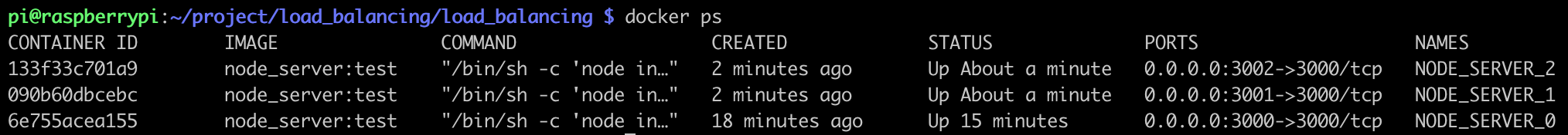 3001번, 3002번 외부 포트를 사용하는 서버를 2개 더 만들었다. 3000번 포트는 NODE_SERVER_0에서 사용 중이므로 중복되지 않게 3001번과 3002번을 사용해준다. 이후 두 컨테이너도 실행해준다.