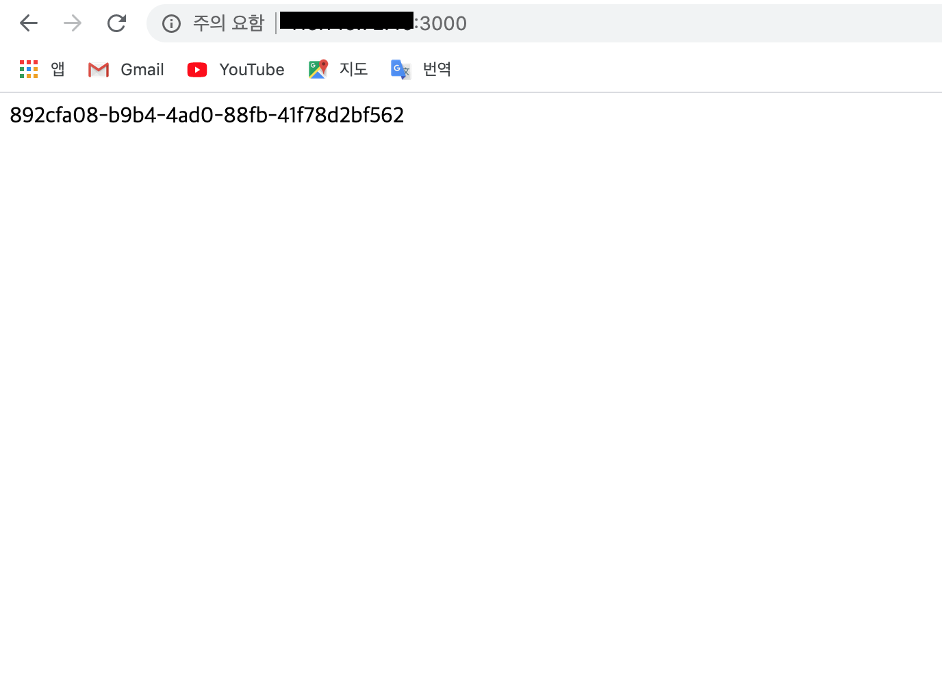 서버 실행 후, 개인 컴퓨터로 실습을 한다면 localhost:3000으로 들어가 보자. 임의로 생성된 ID값이 출력되는 것을 확인할 수 있다.
