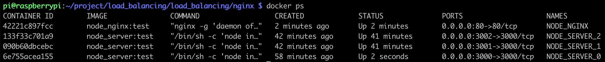 3001번, 3002번 외부 포트를 사용하는 서버를 2개 더 만들었다. 3000번 포트는 NODE_SERVER_0에서 사용 중이므로 중복되지 않게 3001번과 3002번을 사용해준다. 이후 두 컨테이너도 실행해준다.
